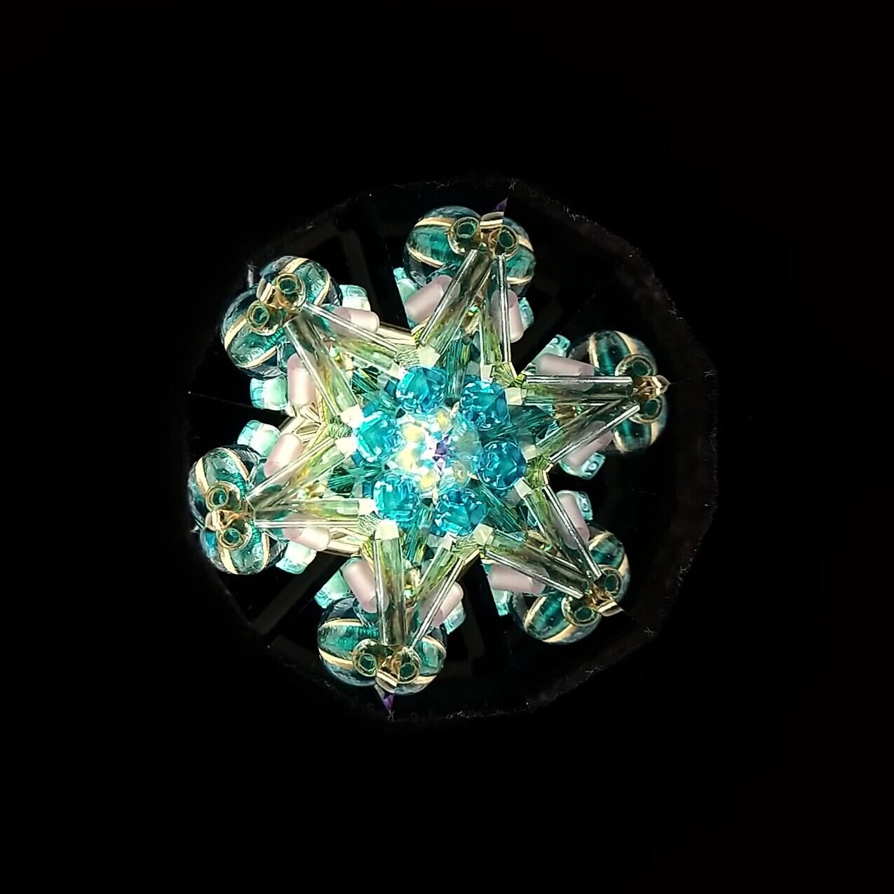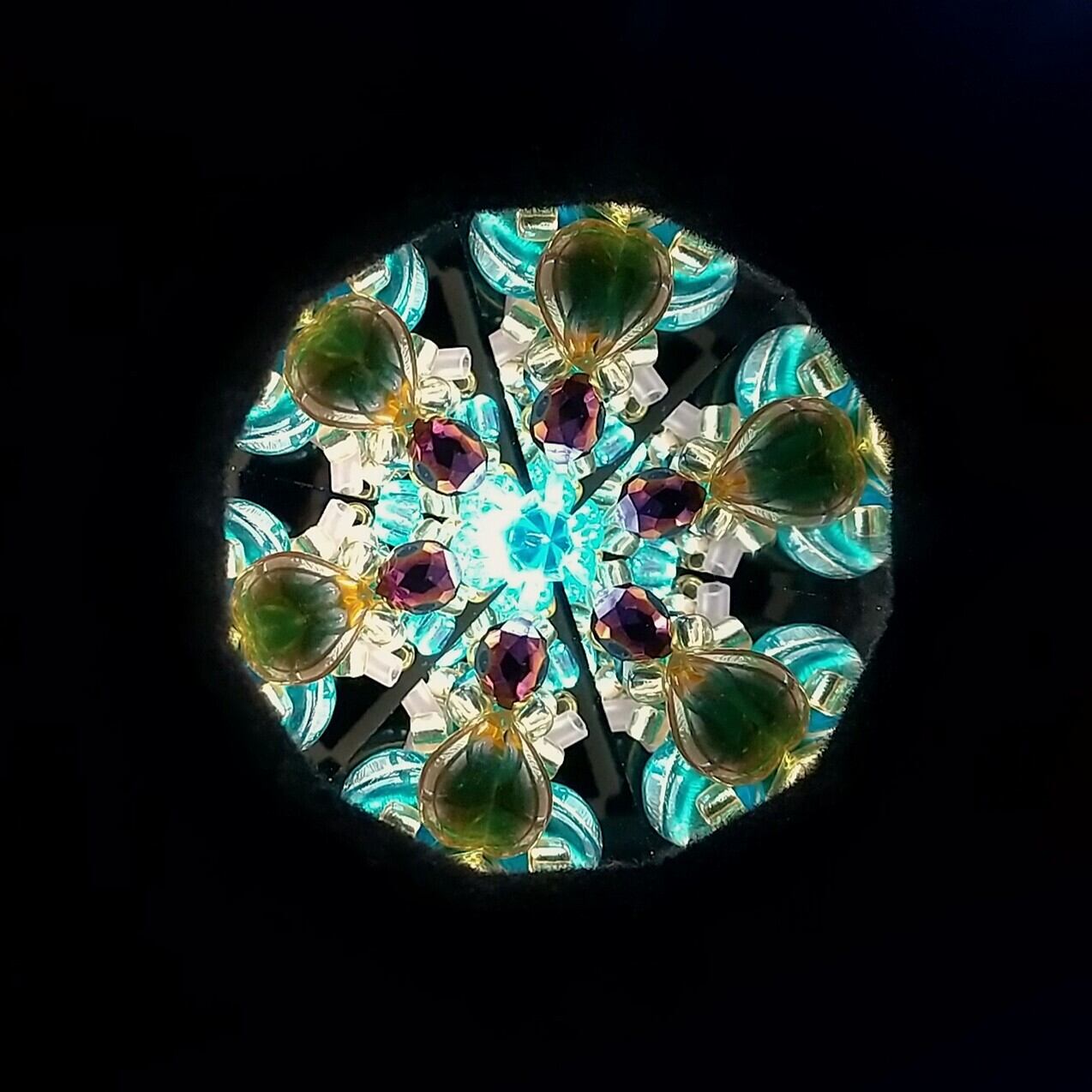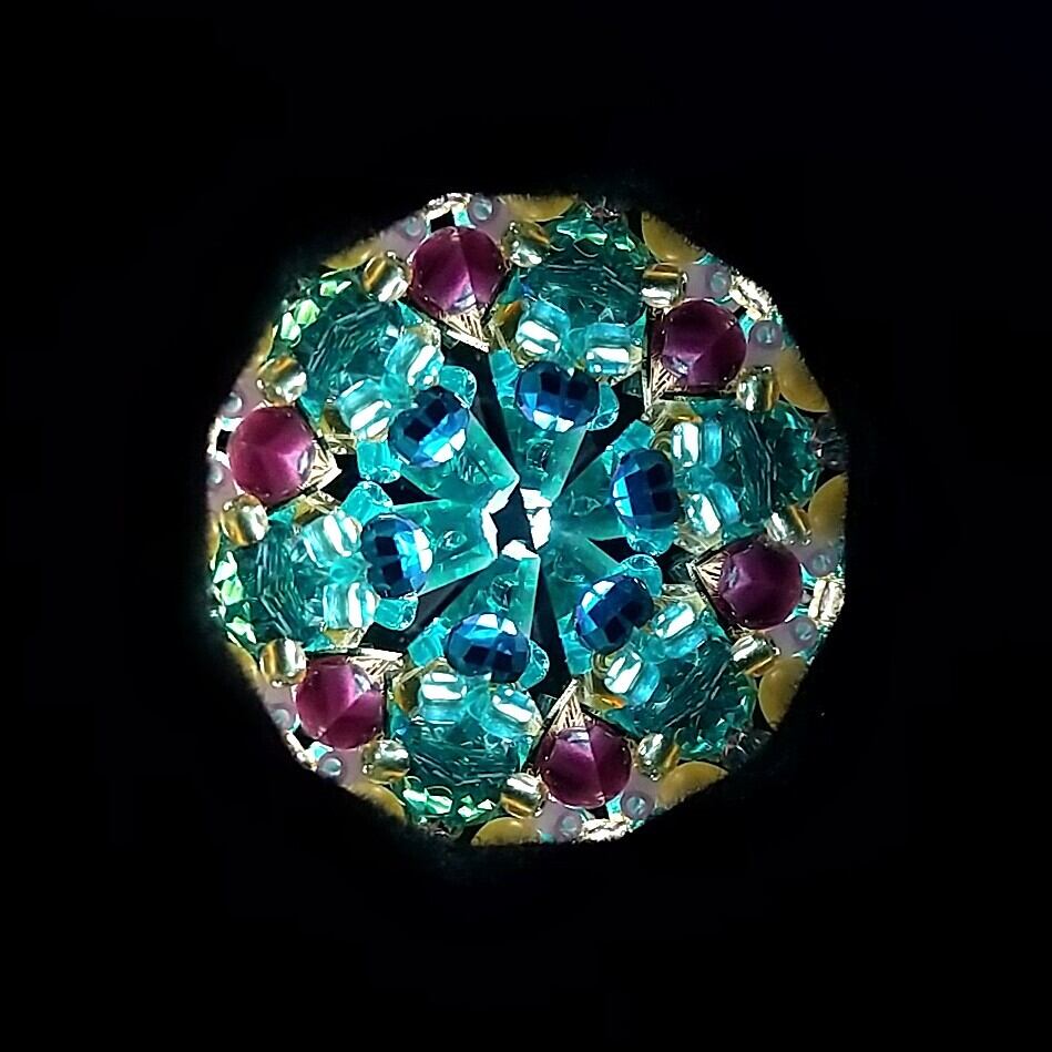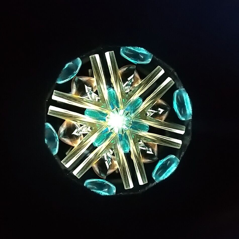 手のひらサイズの小さなドライチェンバータイプの万華鏡。パート・ド・ヴェールというガラス技法で作っています。