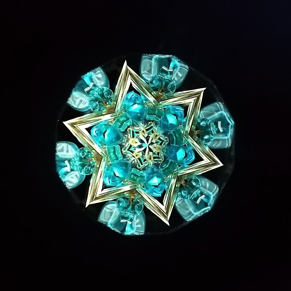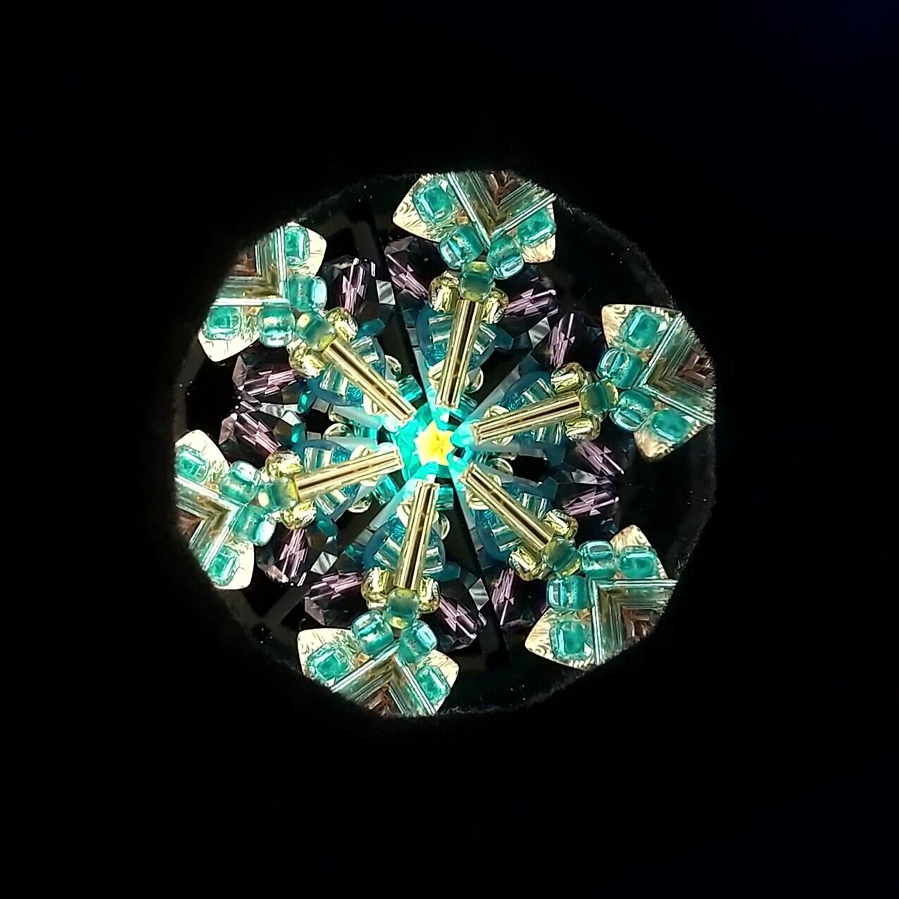 中の映像はターコイズブルーやスチールブルー、イエローゴールドが中心。スモーキーなピンクや濃い紫も時々現れます。まるで宝石箱を覗いているようです。ドライチェンバーならではの、回転させるとカシャカシャと鳴る音もお楽しみください。