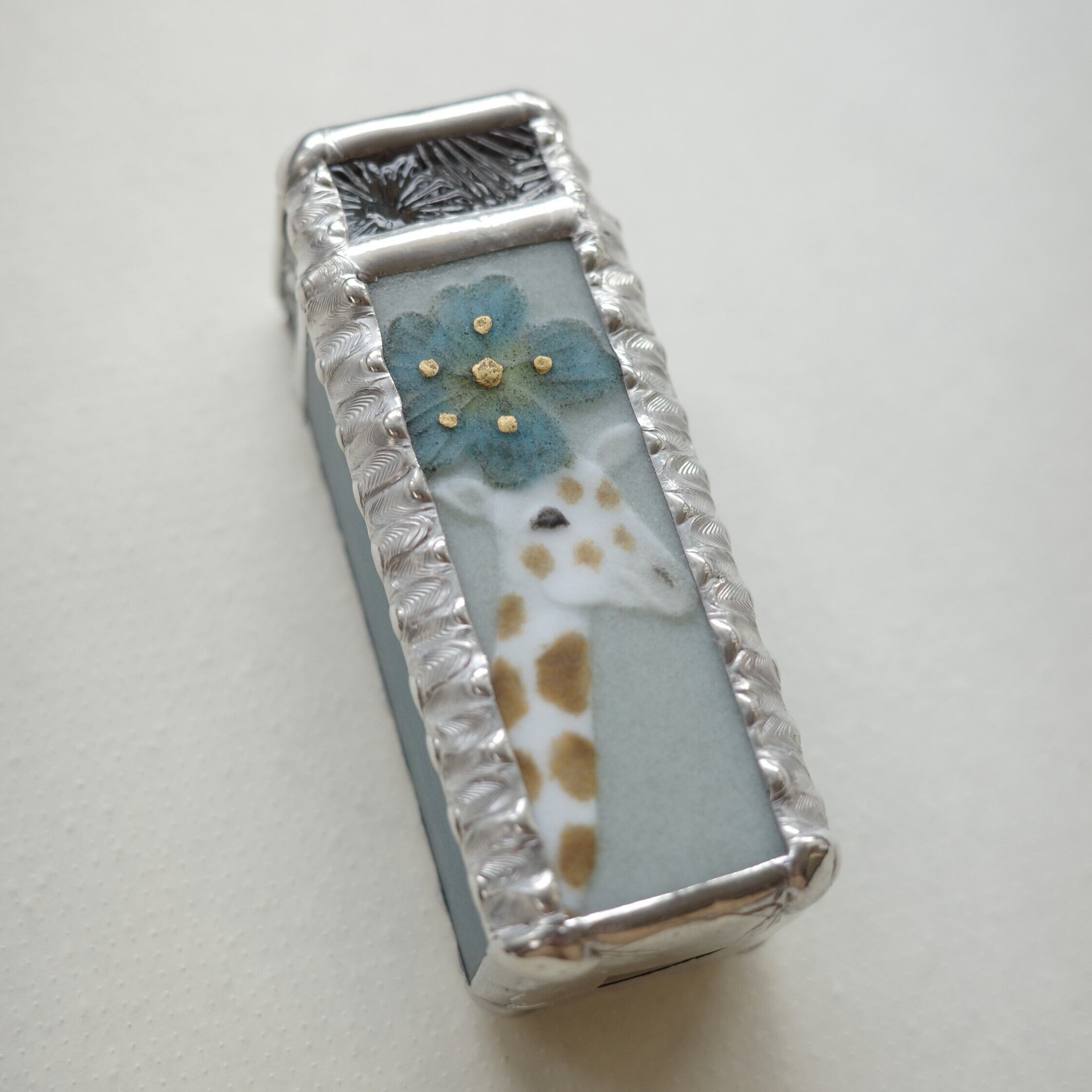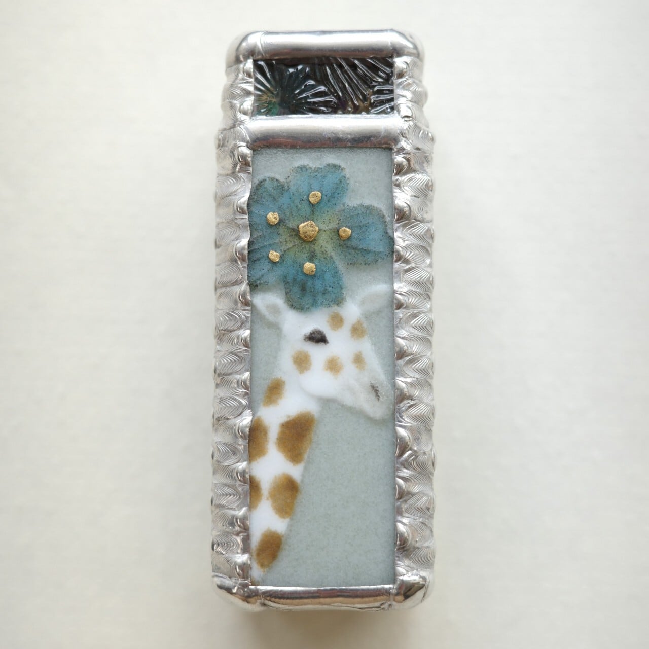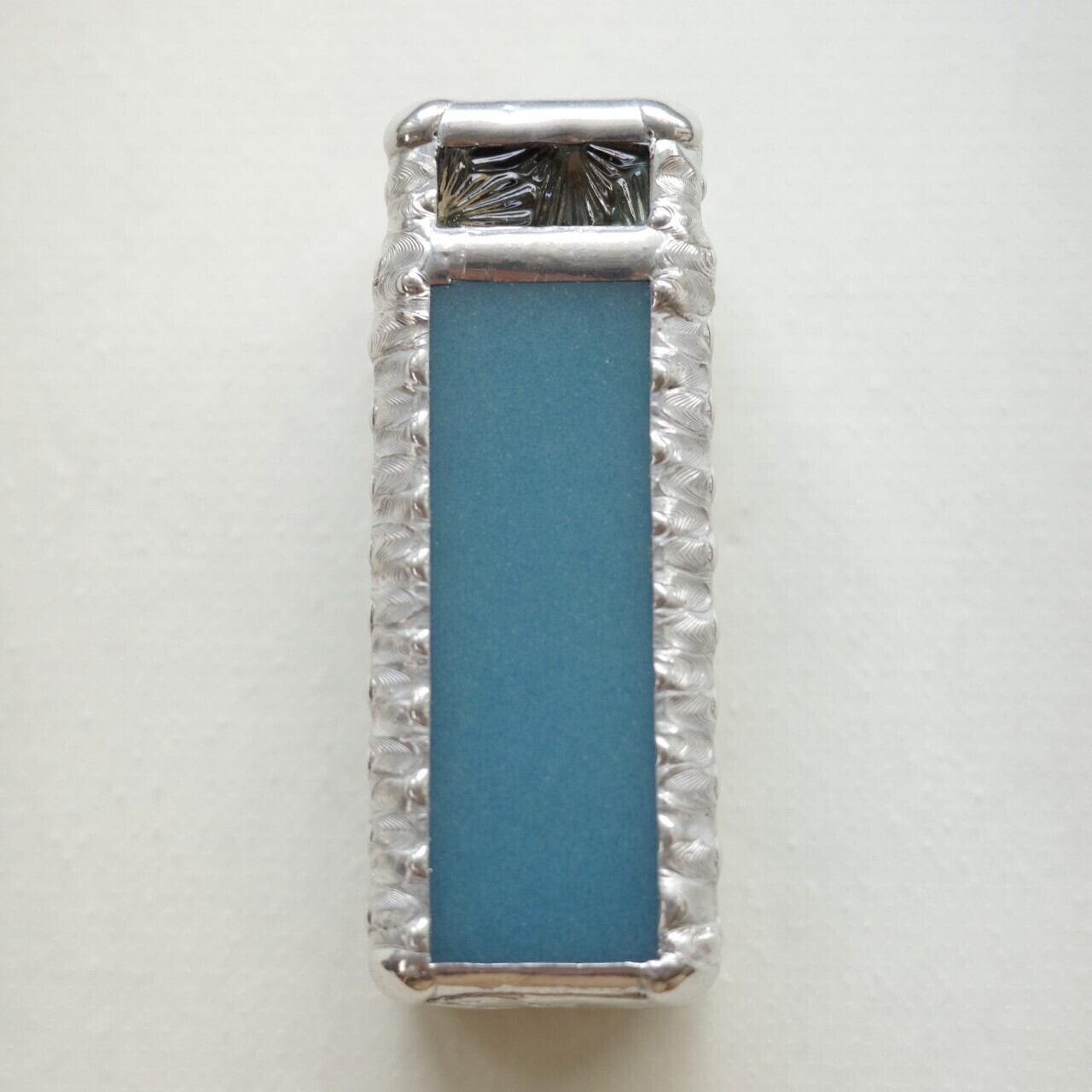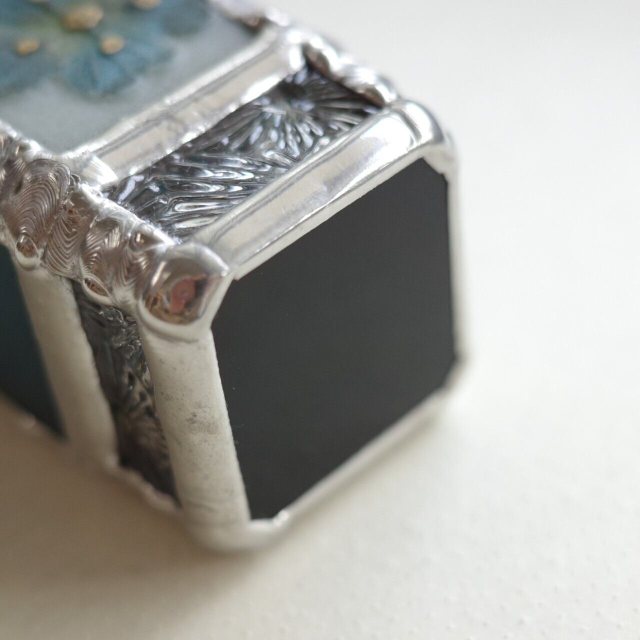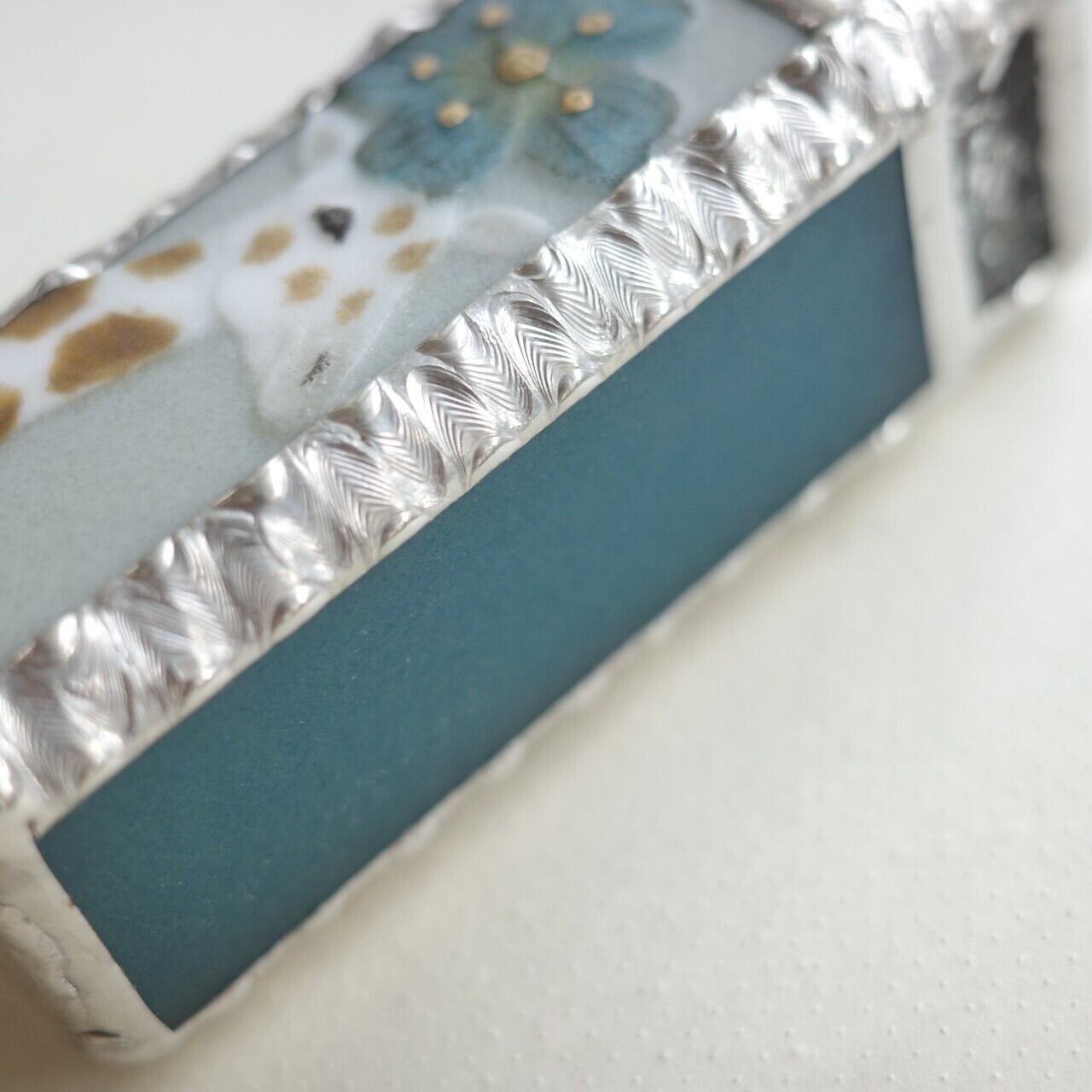 背景の色は青磁のような落ち着いたグリーン。側面と裏面のガラスの色はお花と同じスチールブルーです。