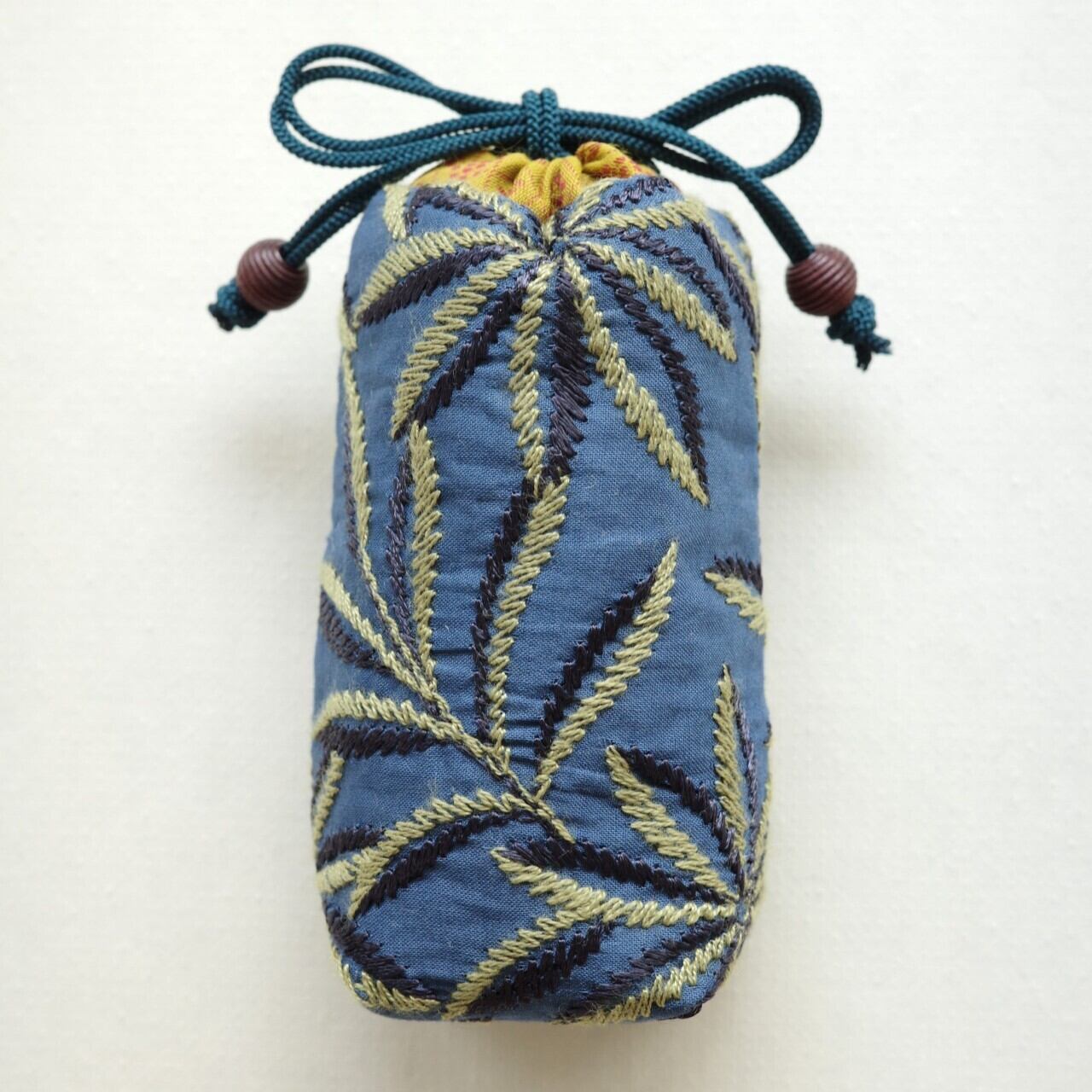 作品のイメージに合わせて1点ずつ手づくりしている専用の袋もセットでお届け。ガラスの色にぴったりのスチールブルーの布で仕立てました。
