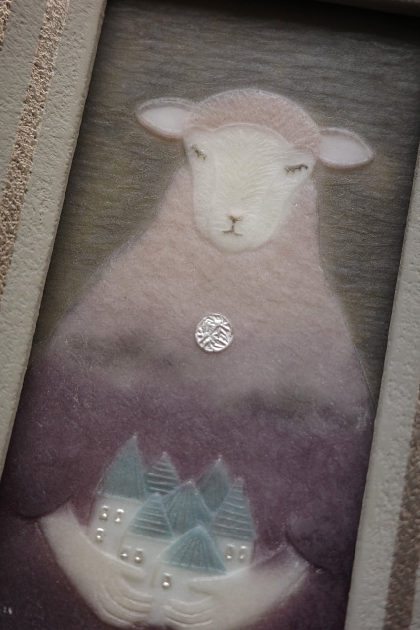 銀色の月が浮かぶ夜空をまとった羊が、窓明かりが灯った町をそっと抱えています。タイトルは『夜を抱えて』。夜がもたらす静けさ、安らかさを羊の姿に託しました。夜をこよなく愛する超夜型人間・みずあめ姉による作品。