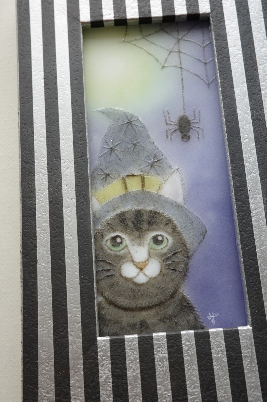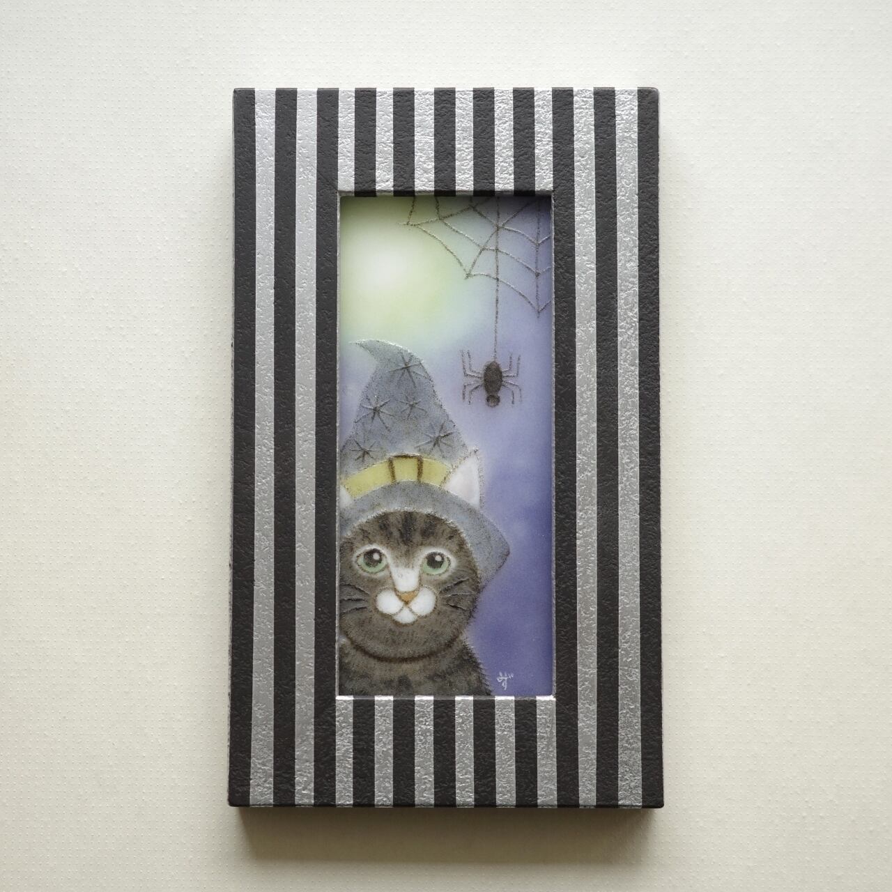 昆虫は苦手!という人もいますが、豚と蜘蛛の温かい交流の物語「シャーロットのおくりもの」のようにこの絵に登場する蜘蛛は子猫と親しくなり、真夜中の探検は子猫にとって大切な時間になっていく…そんな展開を楽しみながら完成した1枚。