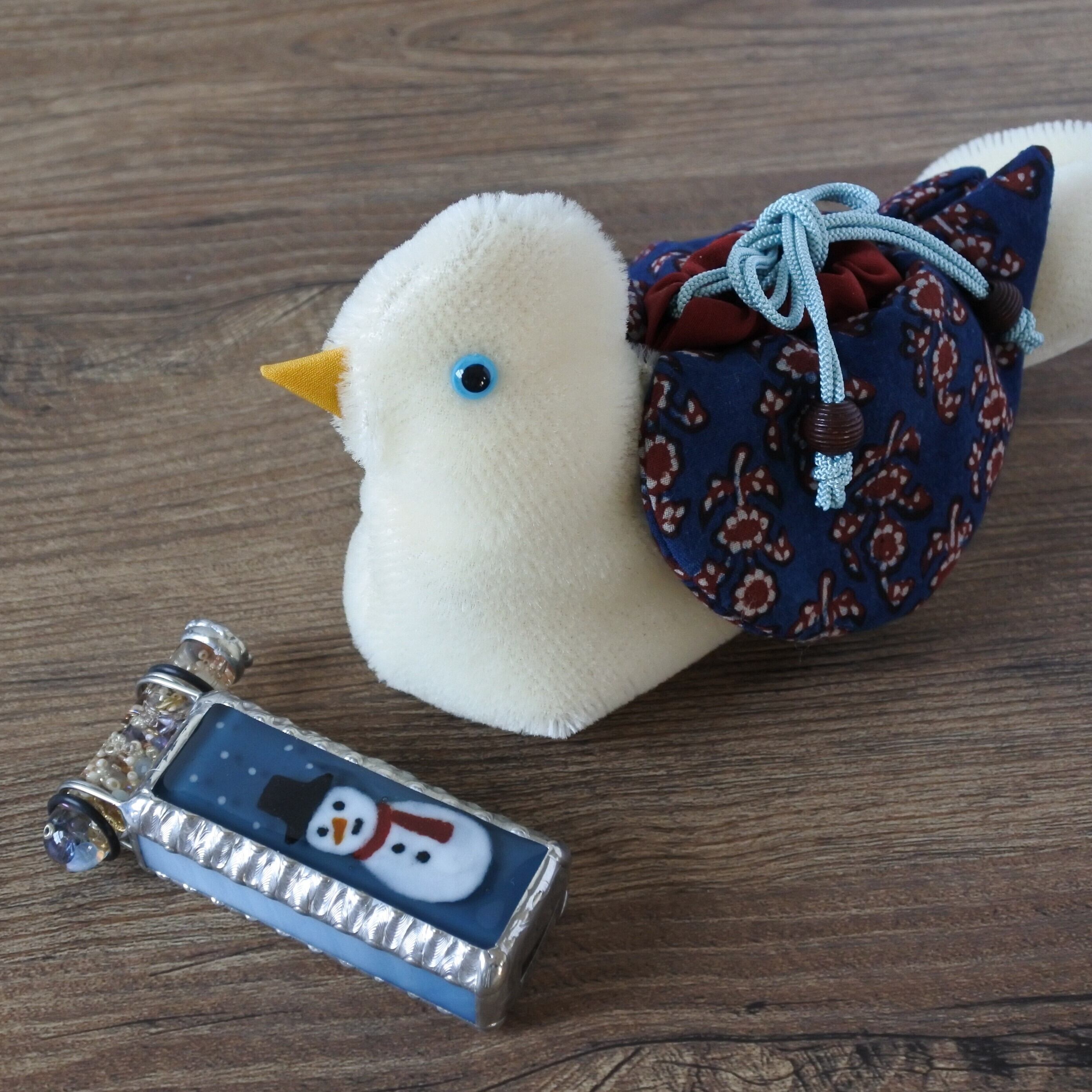 真っ白なボディと青い瞳が印象的な鳩さんにはすっぽりと雪だるまが収納できます。