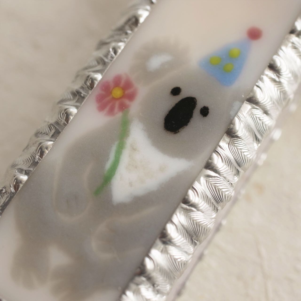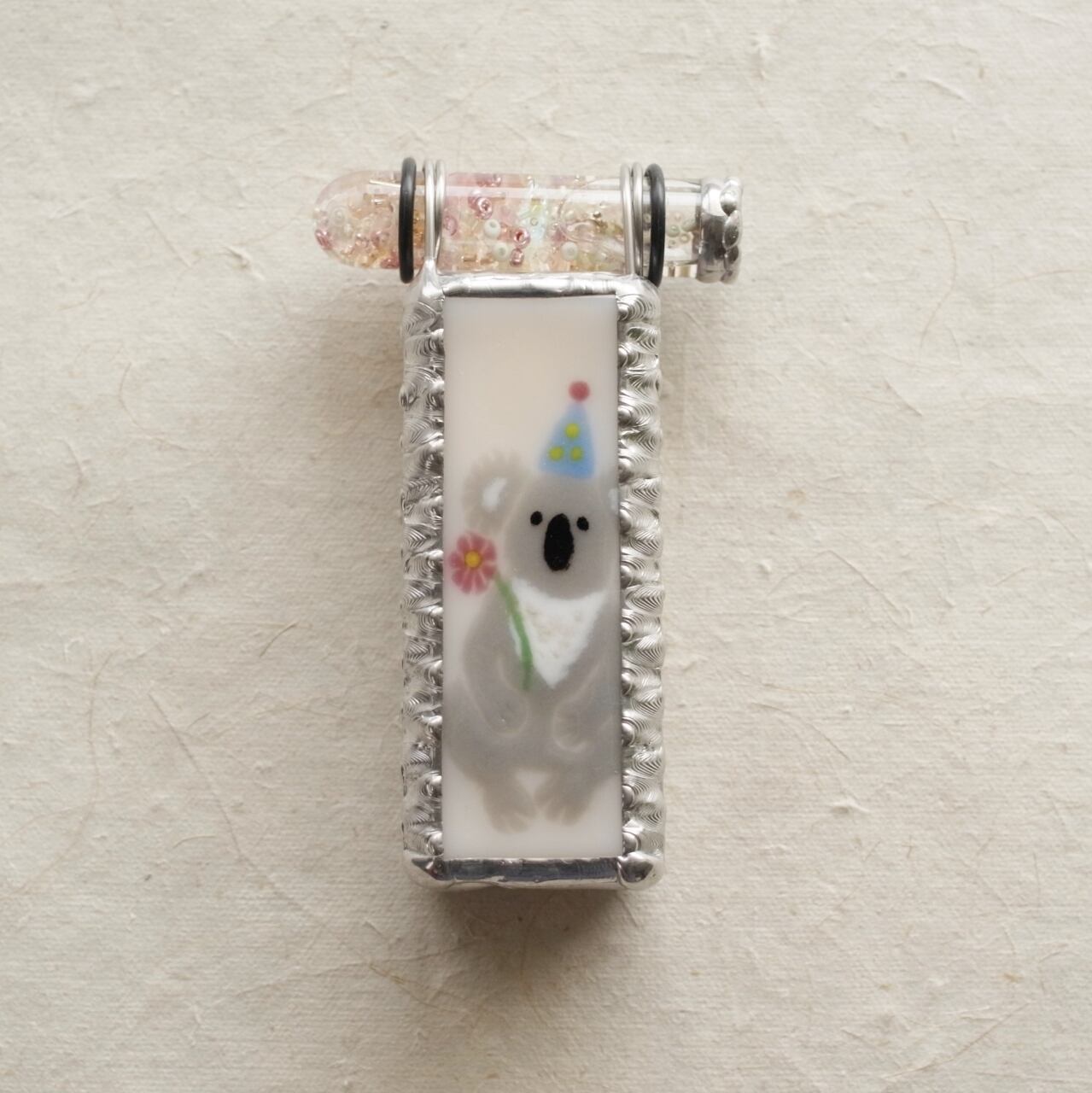 水色のパーティハットにピンク色のお花を持ったコアラ。