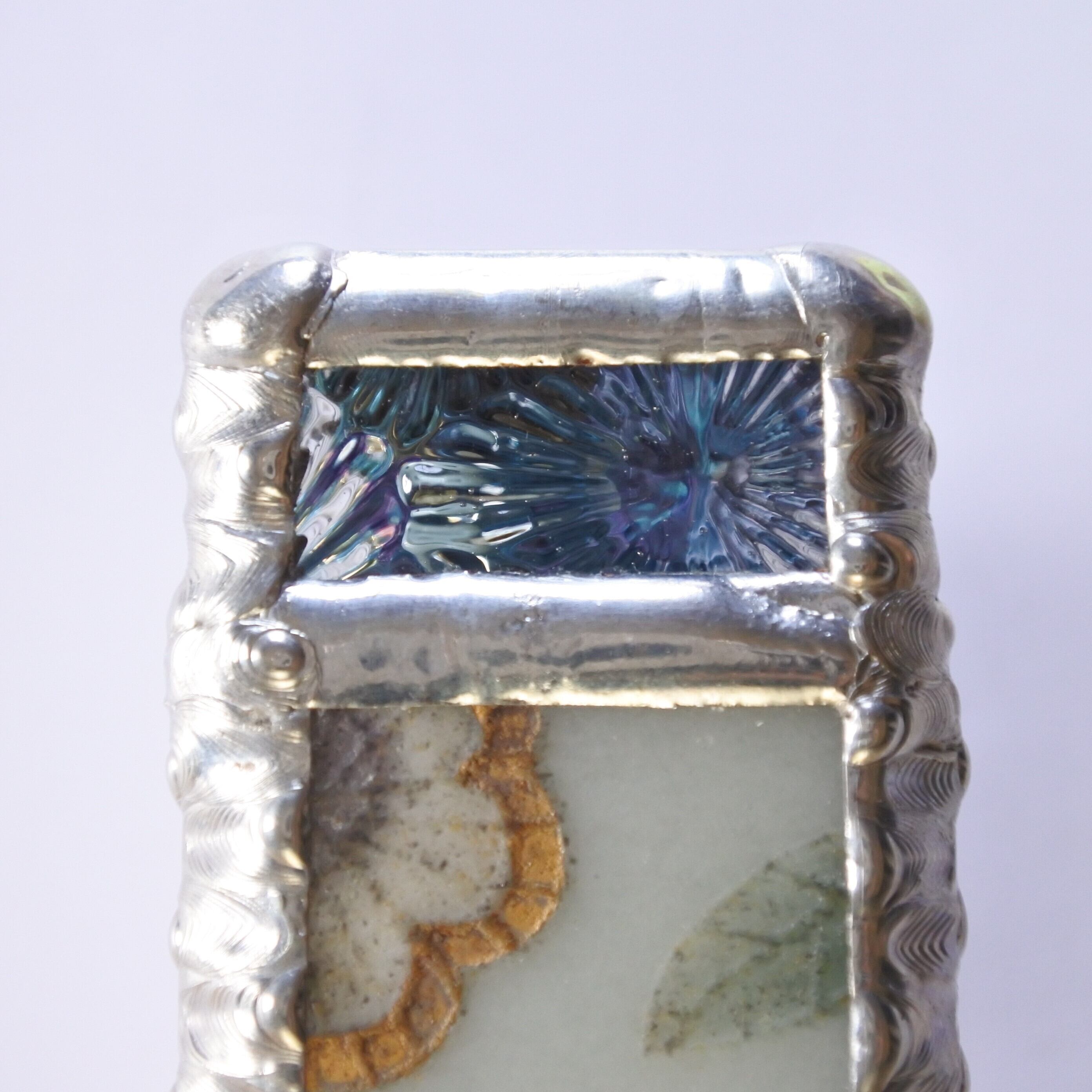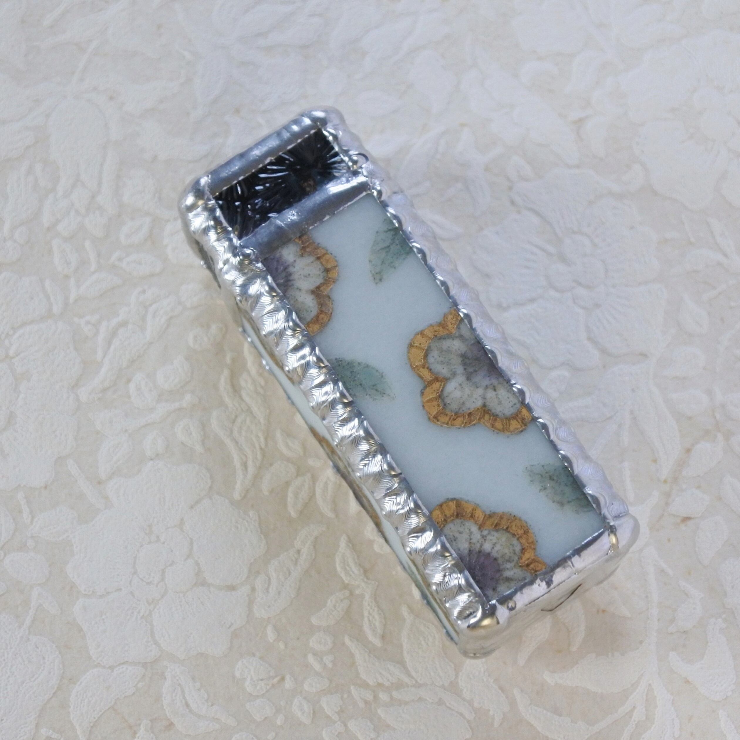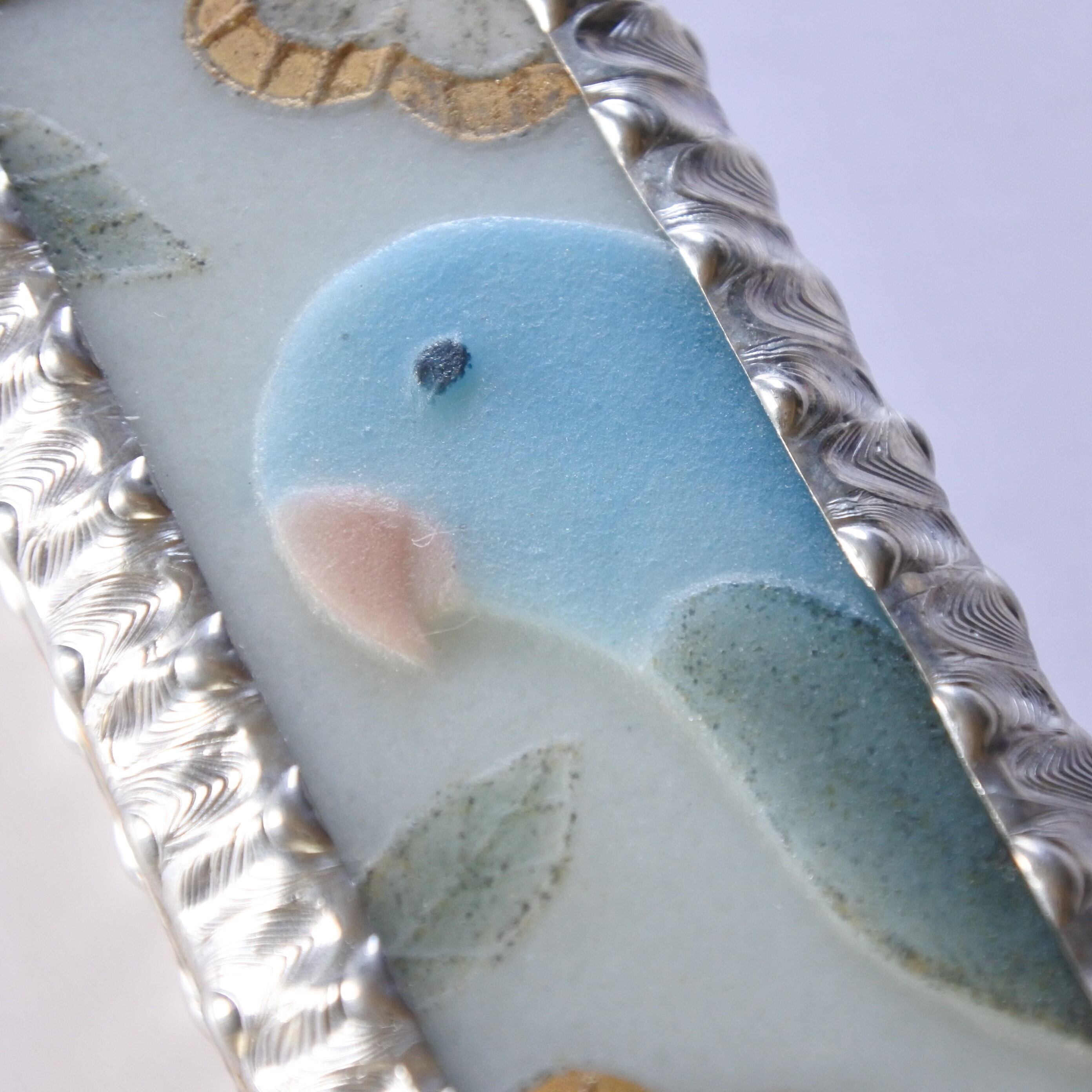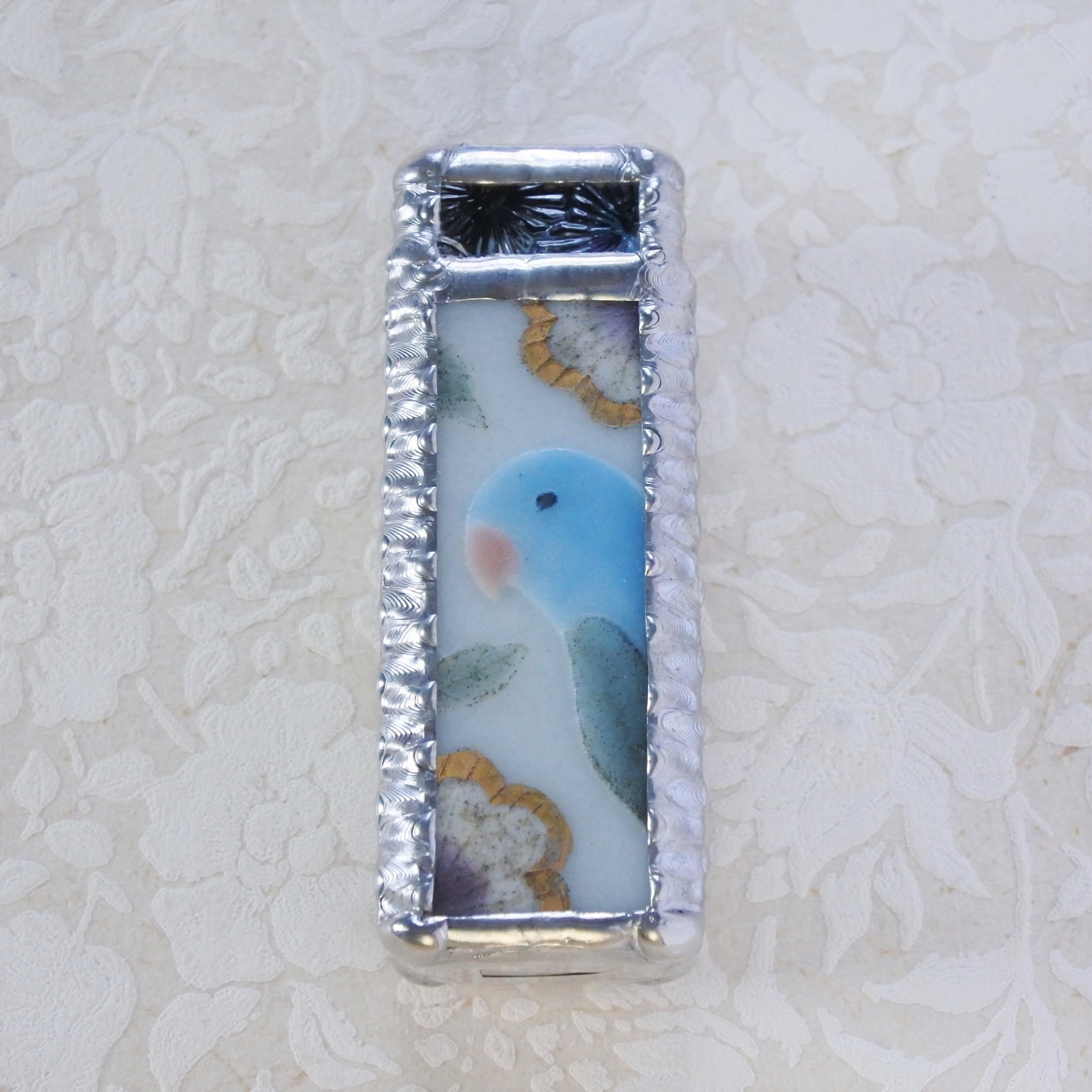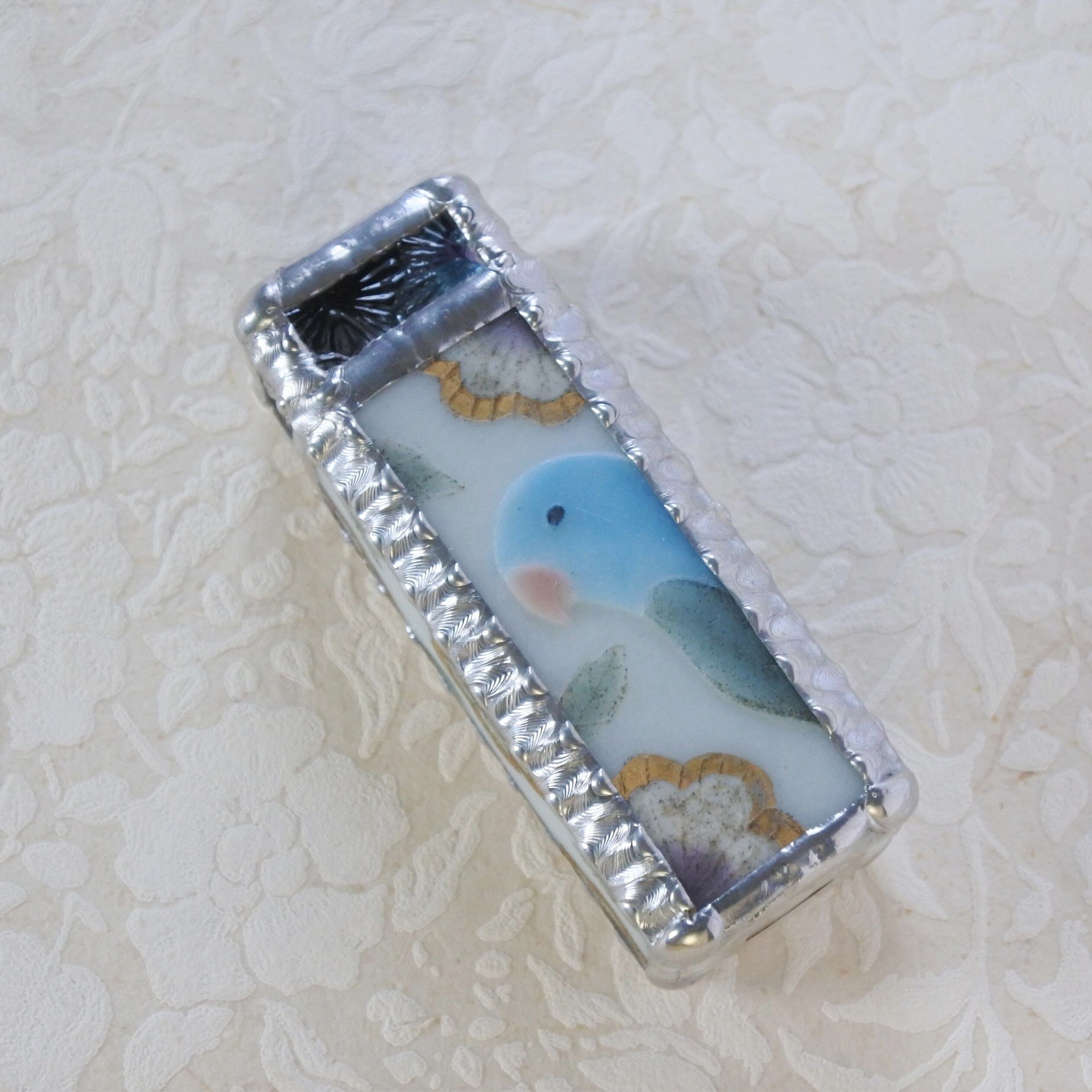 表の面には美しいブルーが印象的なマメルリハと金彩を使用したお花模様、他の面にはお花模様と葉っぱが全面に入っています。本体の背景色はミントグリーンのような淡い水色。