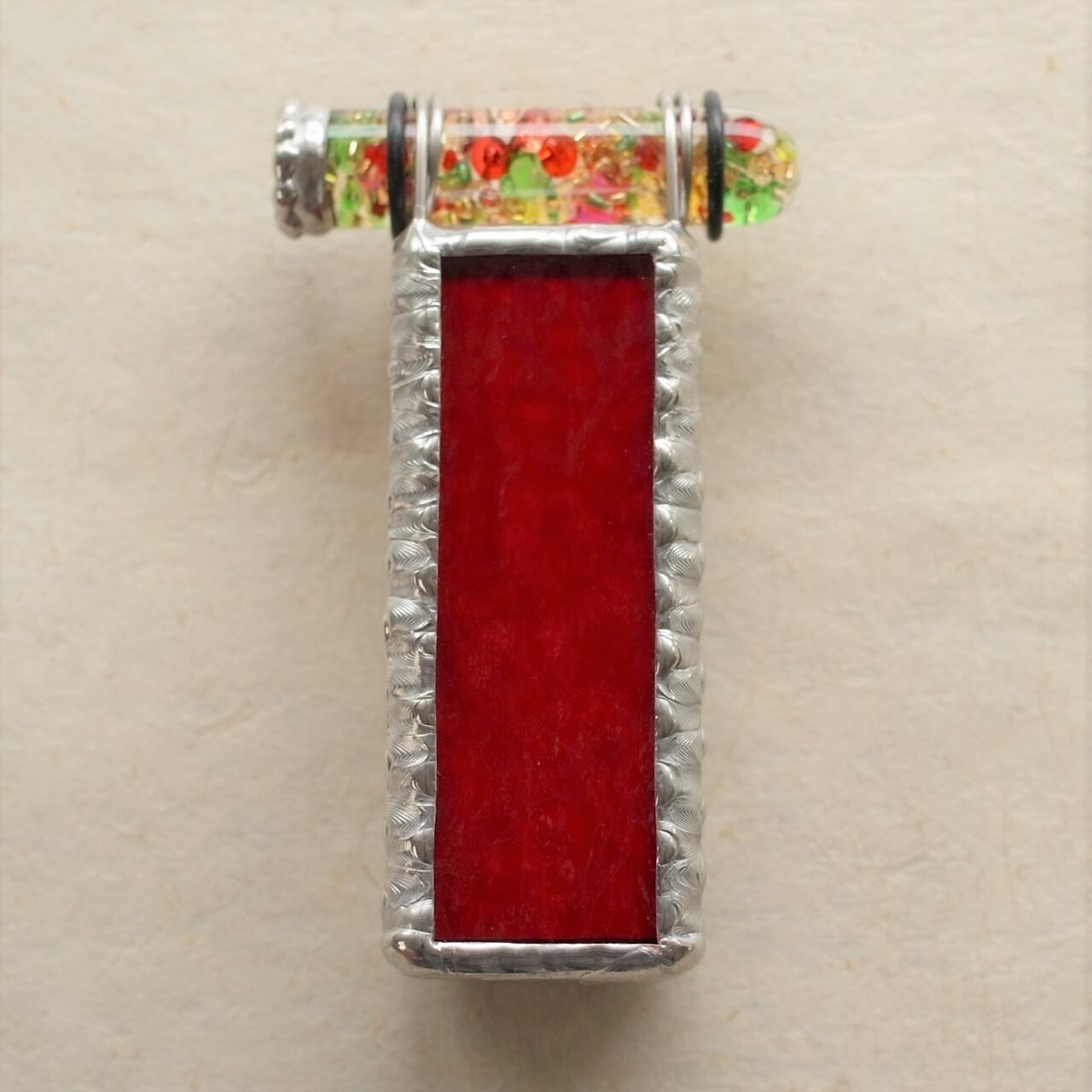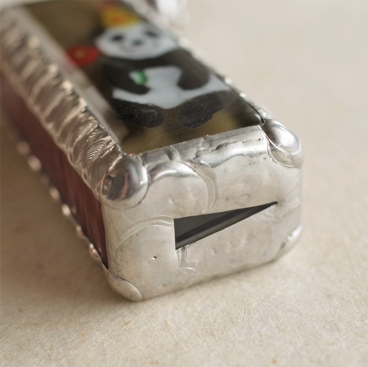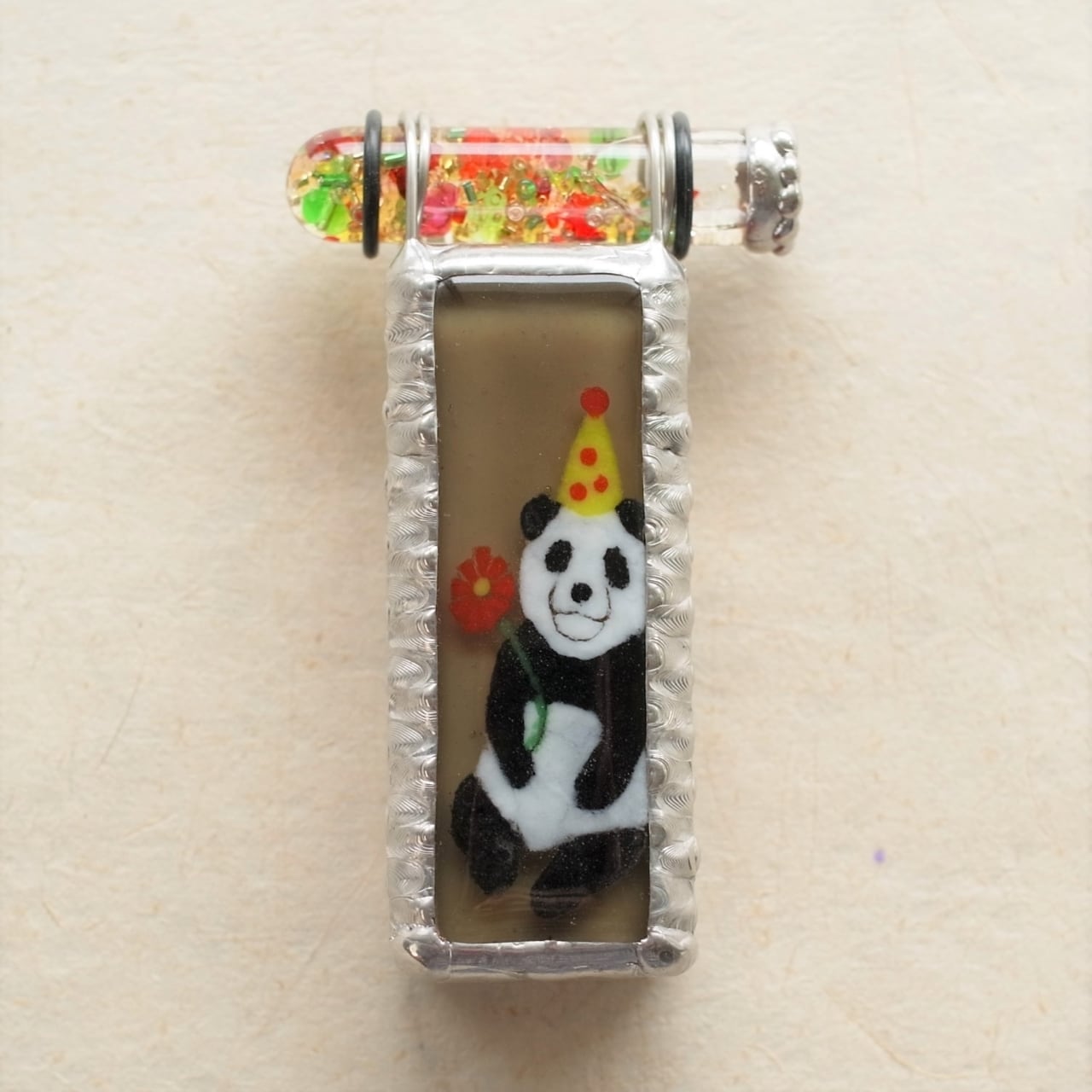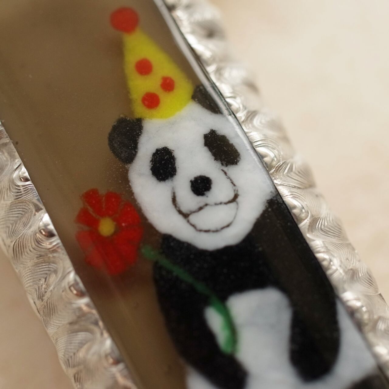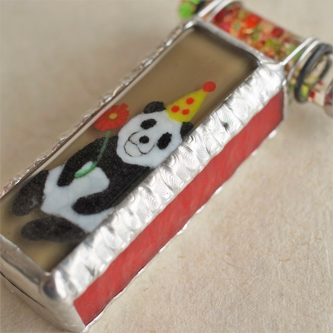 今回はベージュブラウンを背景に鎮座するパンダ氏。手にした赤いお花に合わせ、脇と裏面は鮮やかな赤いガラスです。黄色いパーティーハットがよくお似合い。今回もいい表情です。