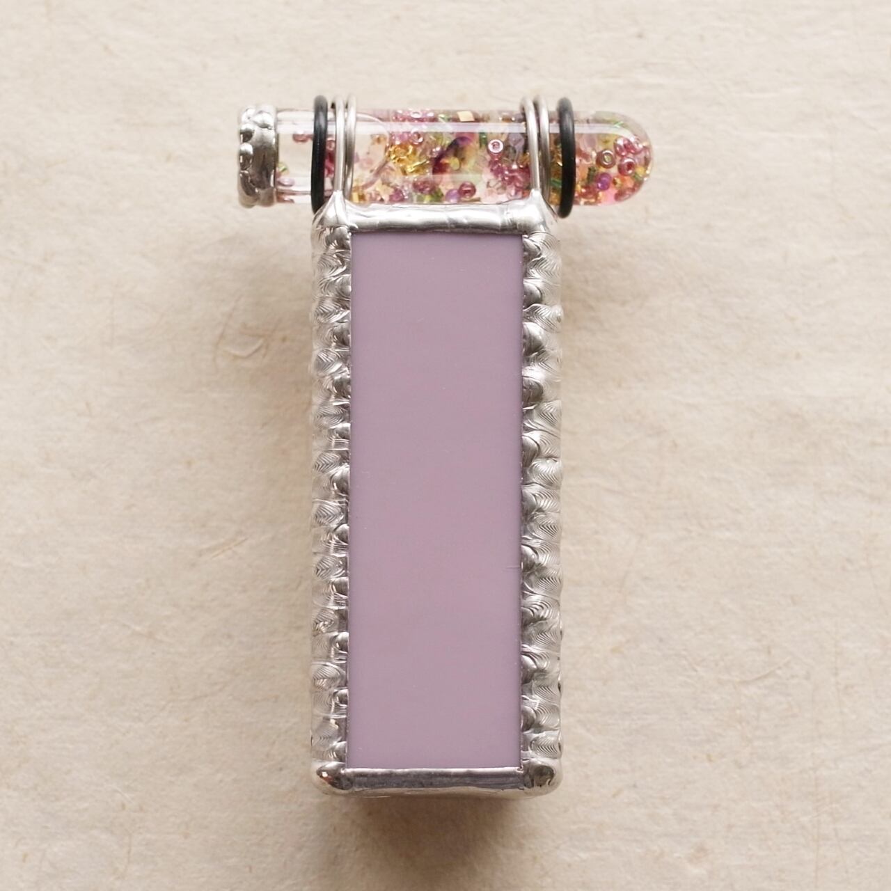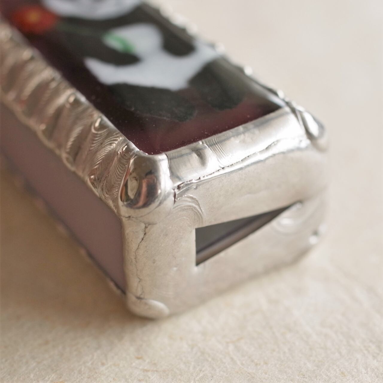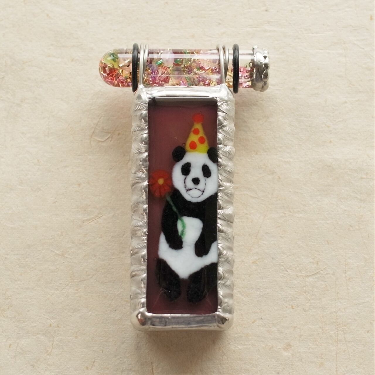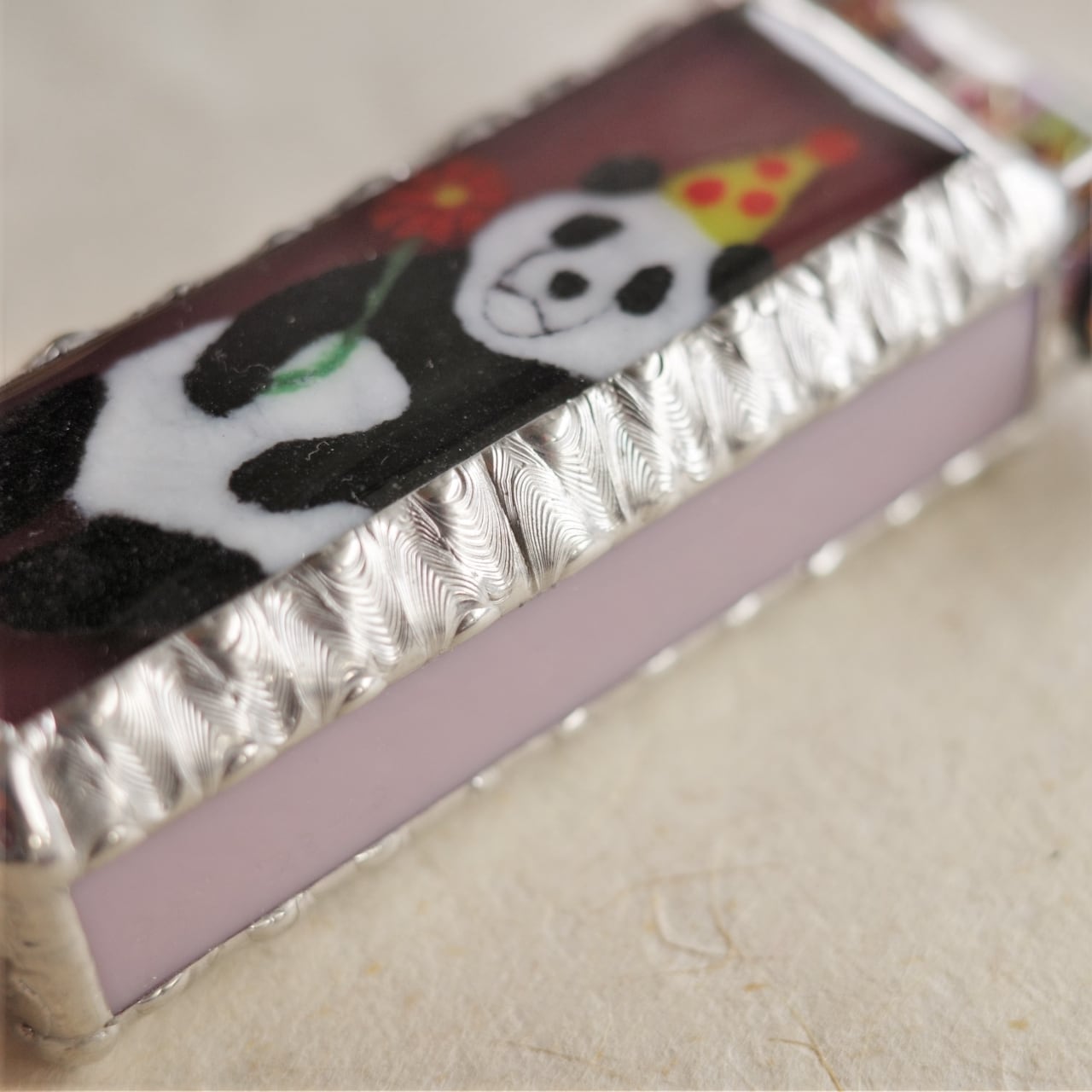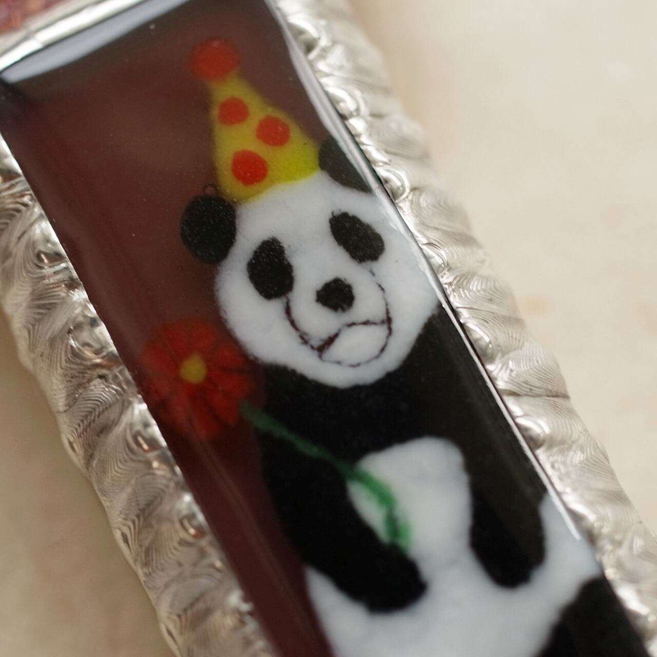こちらはワインレッド色の背景、脇と裏面には淡いピンクのガラスを使用しています。ベージュのパンダ氏に比べてなんとなく大きい?口元もちょっとへの字で、こちらをじーっと見据えて何か言いたげにも見えます。同じ絵柄でもそれぞれ個性がありますね。