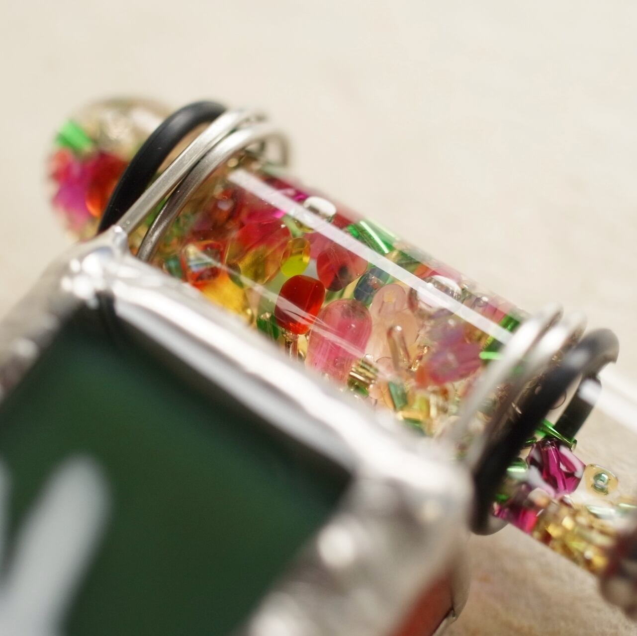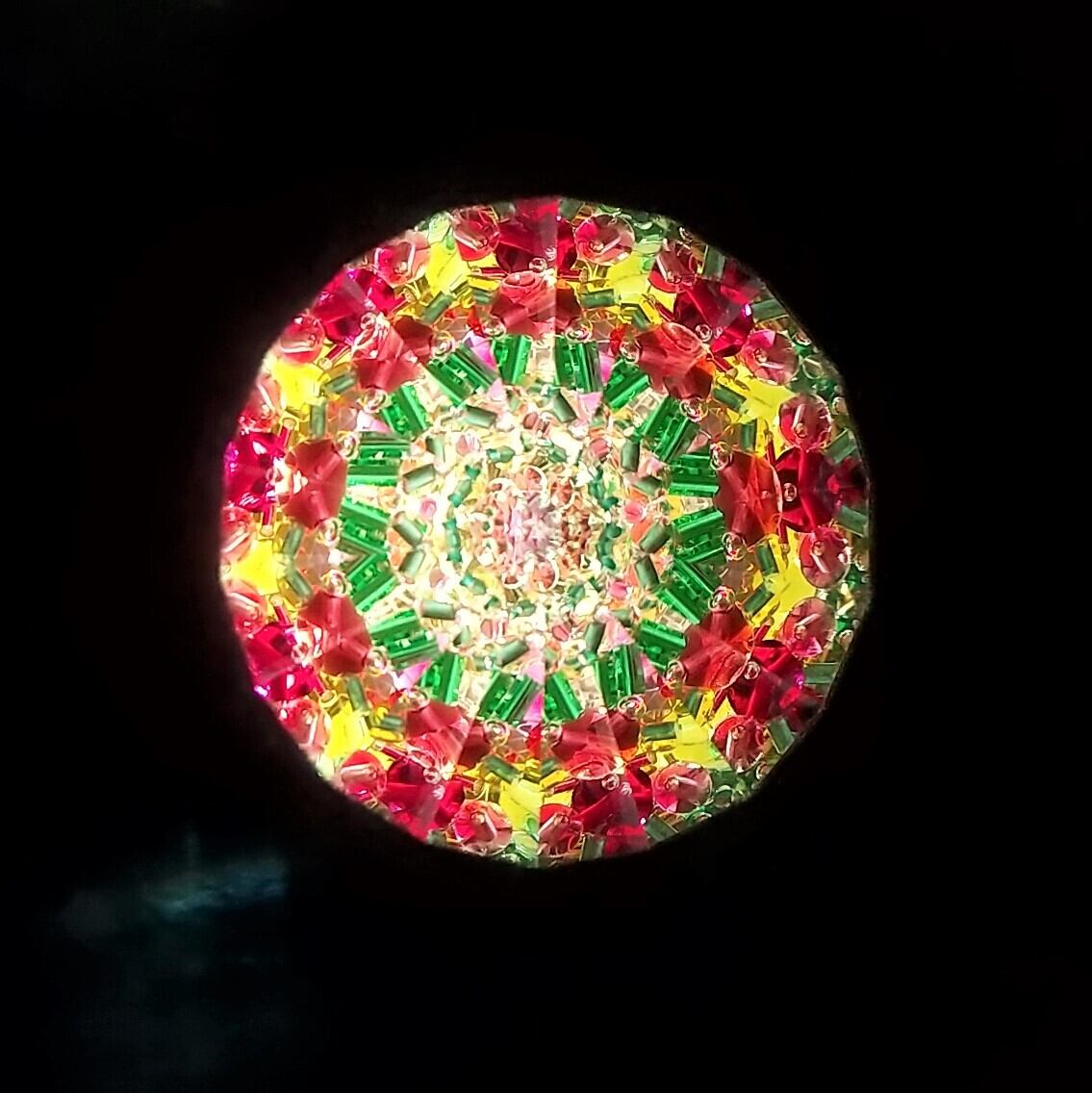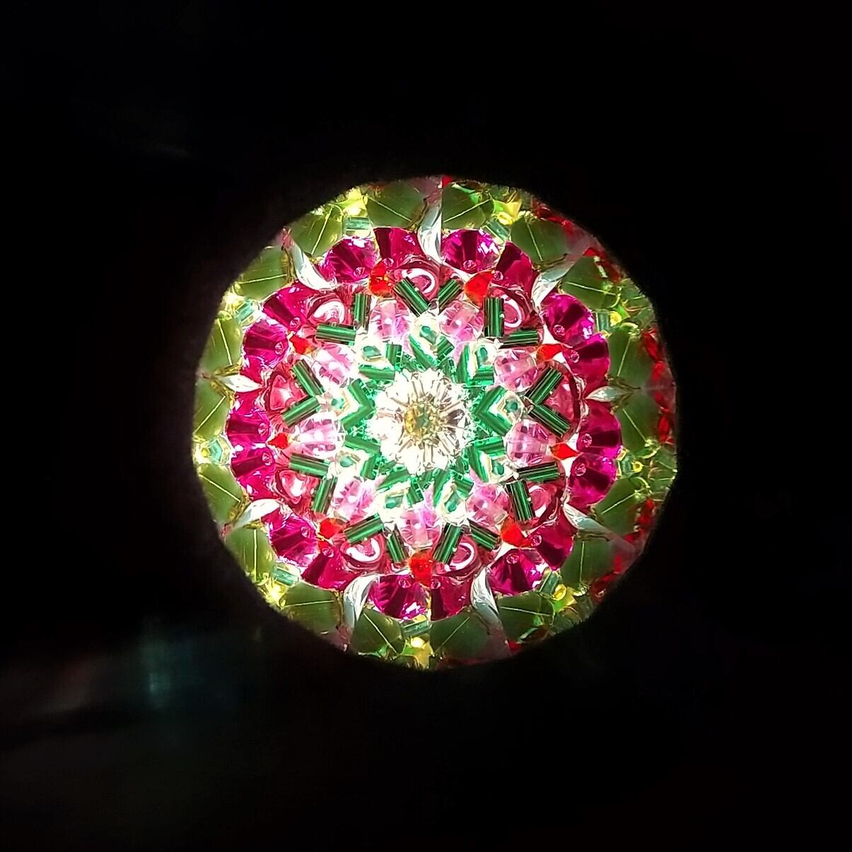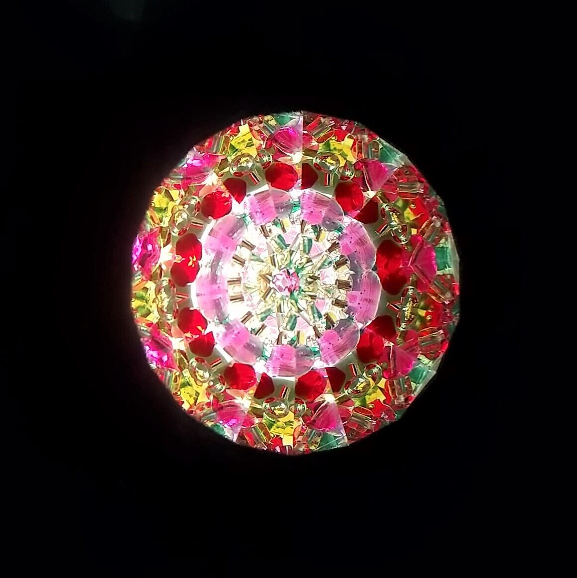 先端にはオイルとビーズが詰められたスティックがついていて、これをクルクル回すことで映像が変化します。赤やピンク、グリーンがメインで、お花畑のような鮮やかな映像をお楽しみ頂けます。