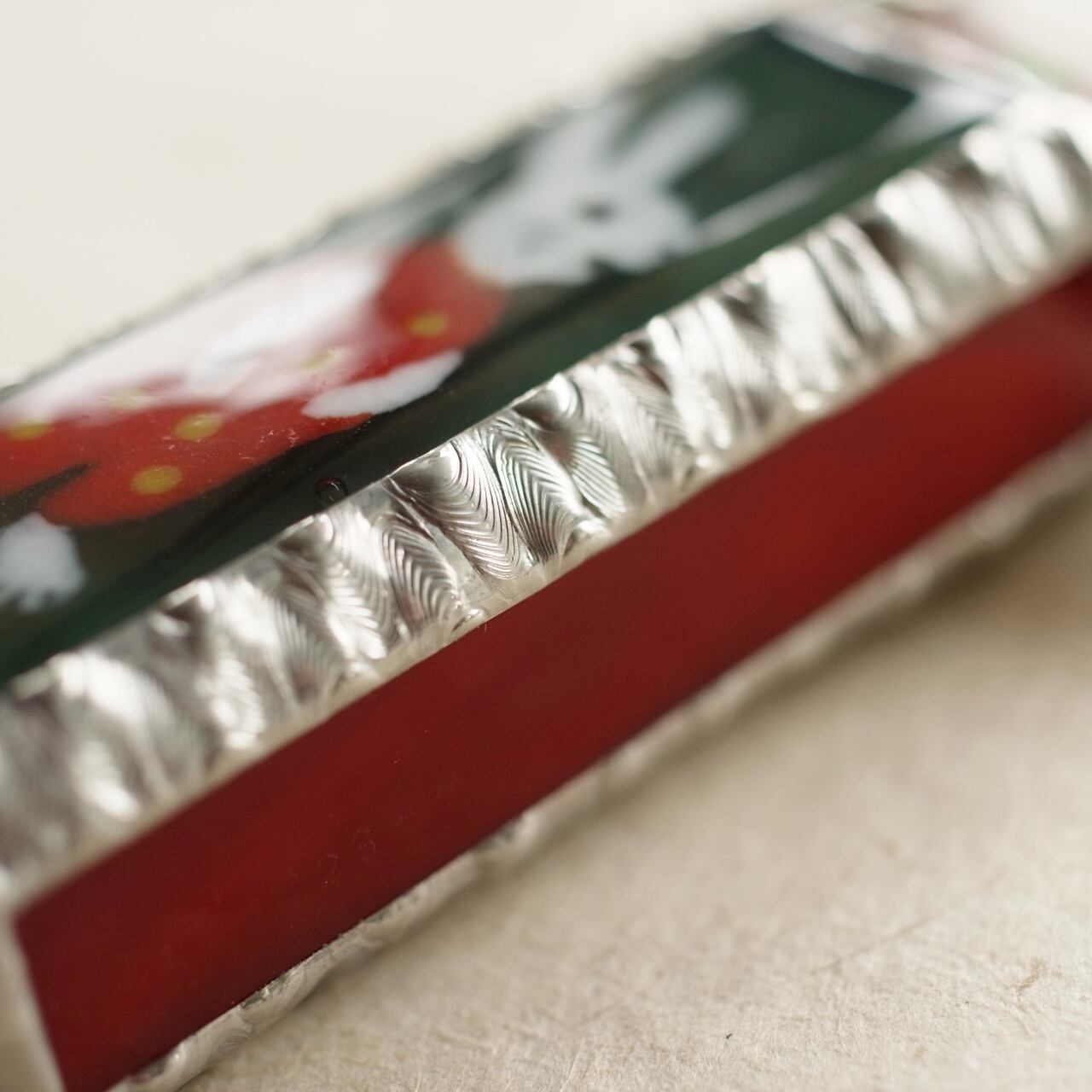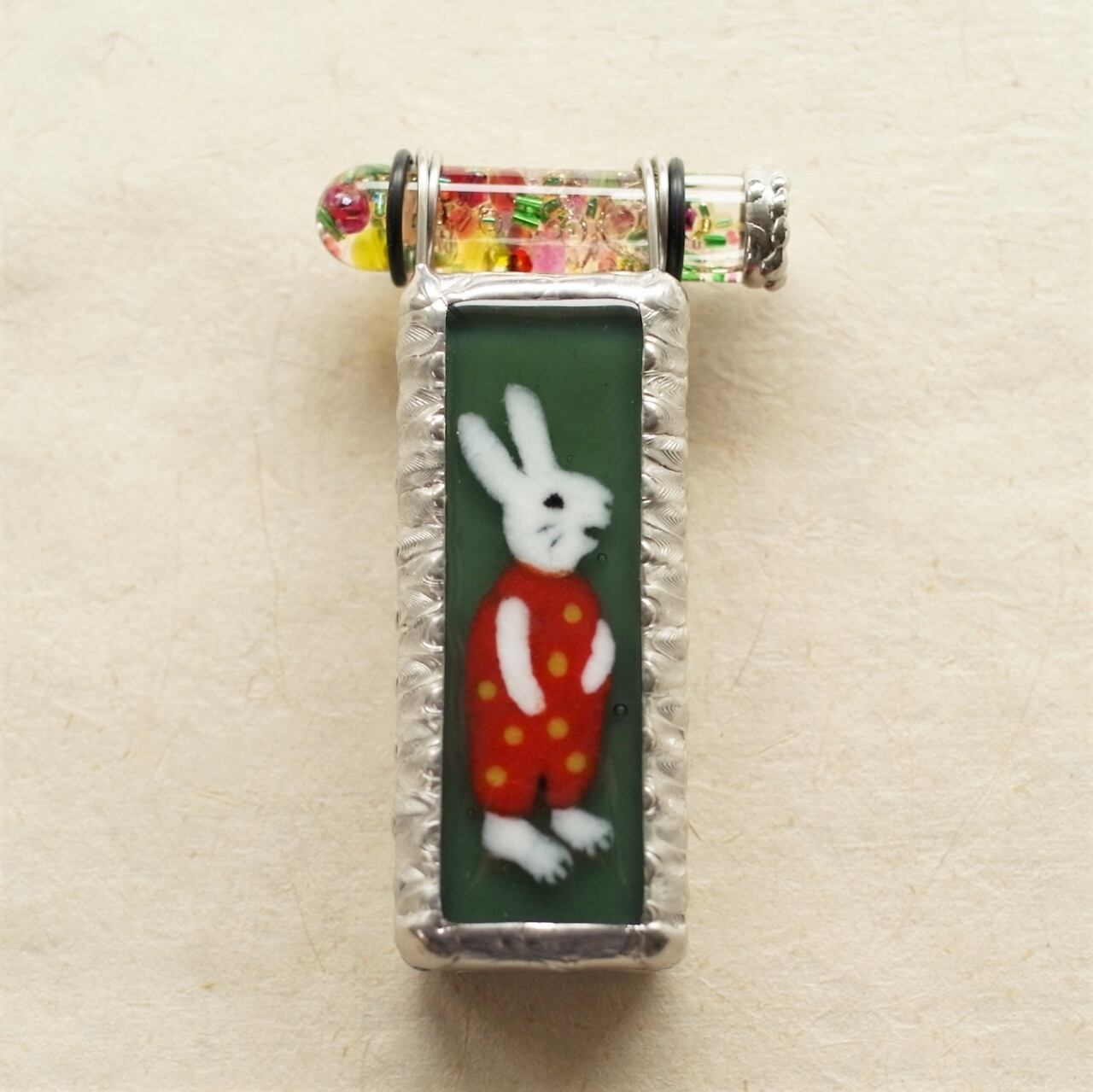 色や衣装を変えて何度も作られているうさぎ柄ですが、今回の子は渋いオリーブグリーンの背景に、赤に黄色の水玉模様のロンパースを着ています。ニカッとお口を開いて、なんともご機嫌のご様子。脇と裏面のガラスは、ロンパースの色に合わせて鮮やかな赤にしました。