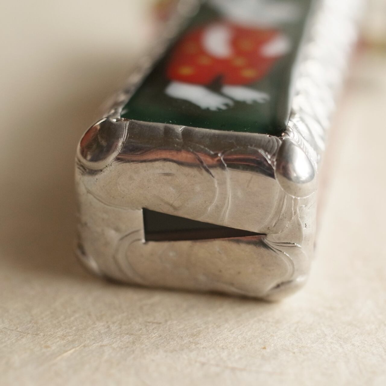 板ガラスの上にガラスの粉をのせて焼き付ける”ガラス胎七宝”の技法で絵付けした、みずあめやのてのひらサイズ万華鏡。