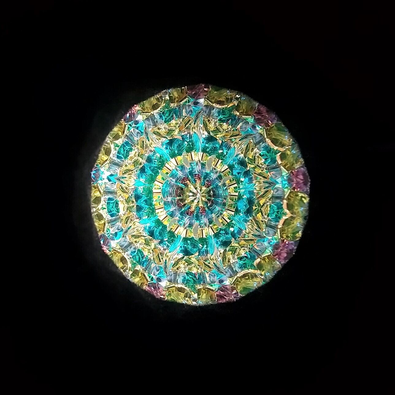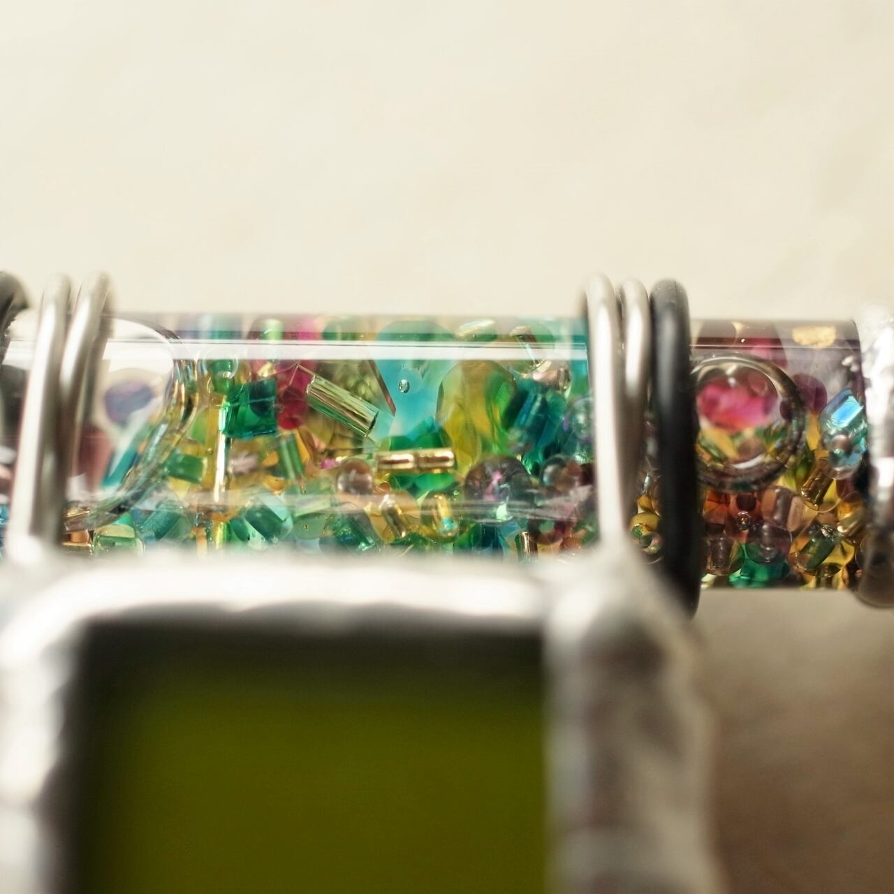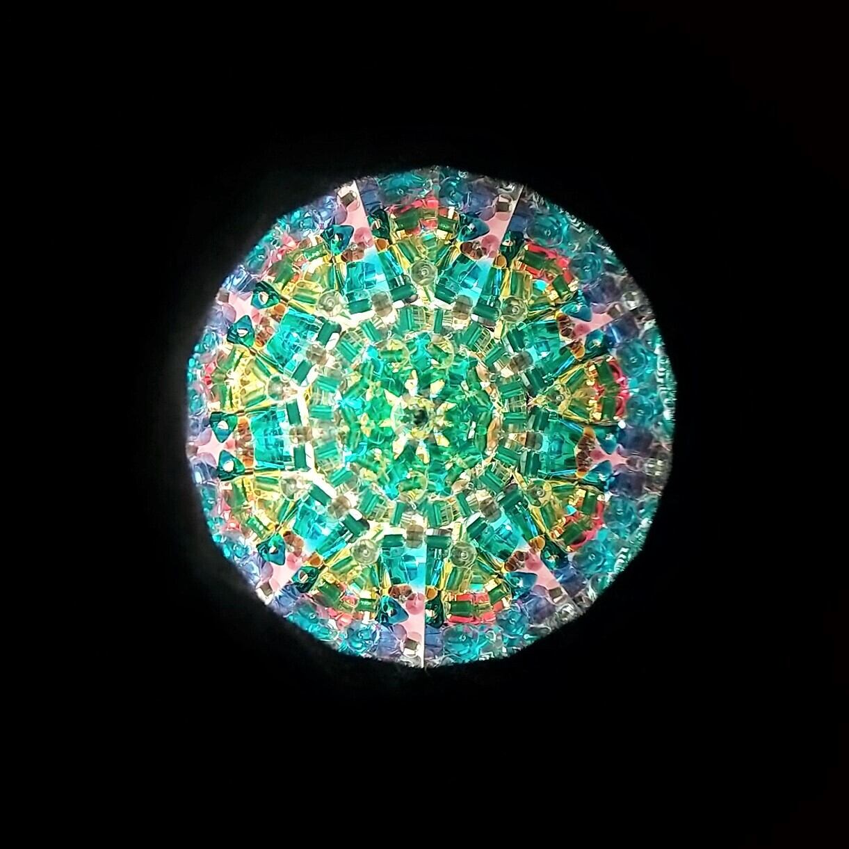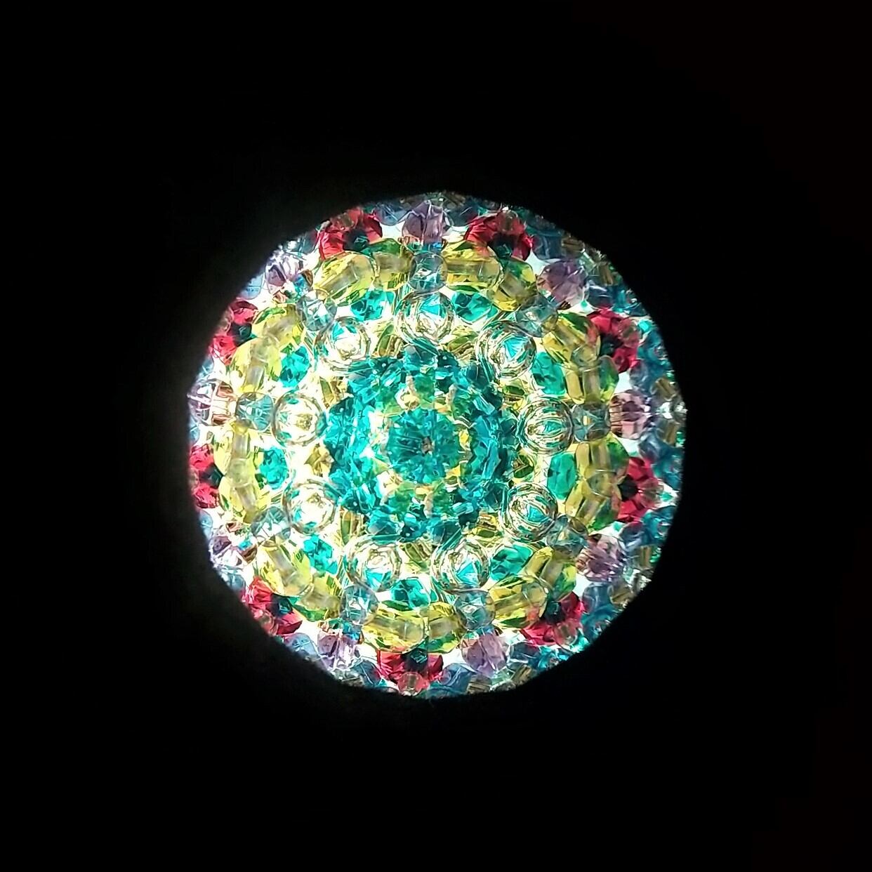 先端にはオイルとビーズが詰められたスティックがついていて、これをクルクル回すことで映像が変化します。エメラルドグリーンに青、紫、赤紫が散りばめられた、孔雀の羽のような華やかな映像をお楽しみ頂けます。