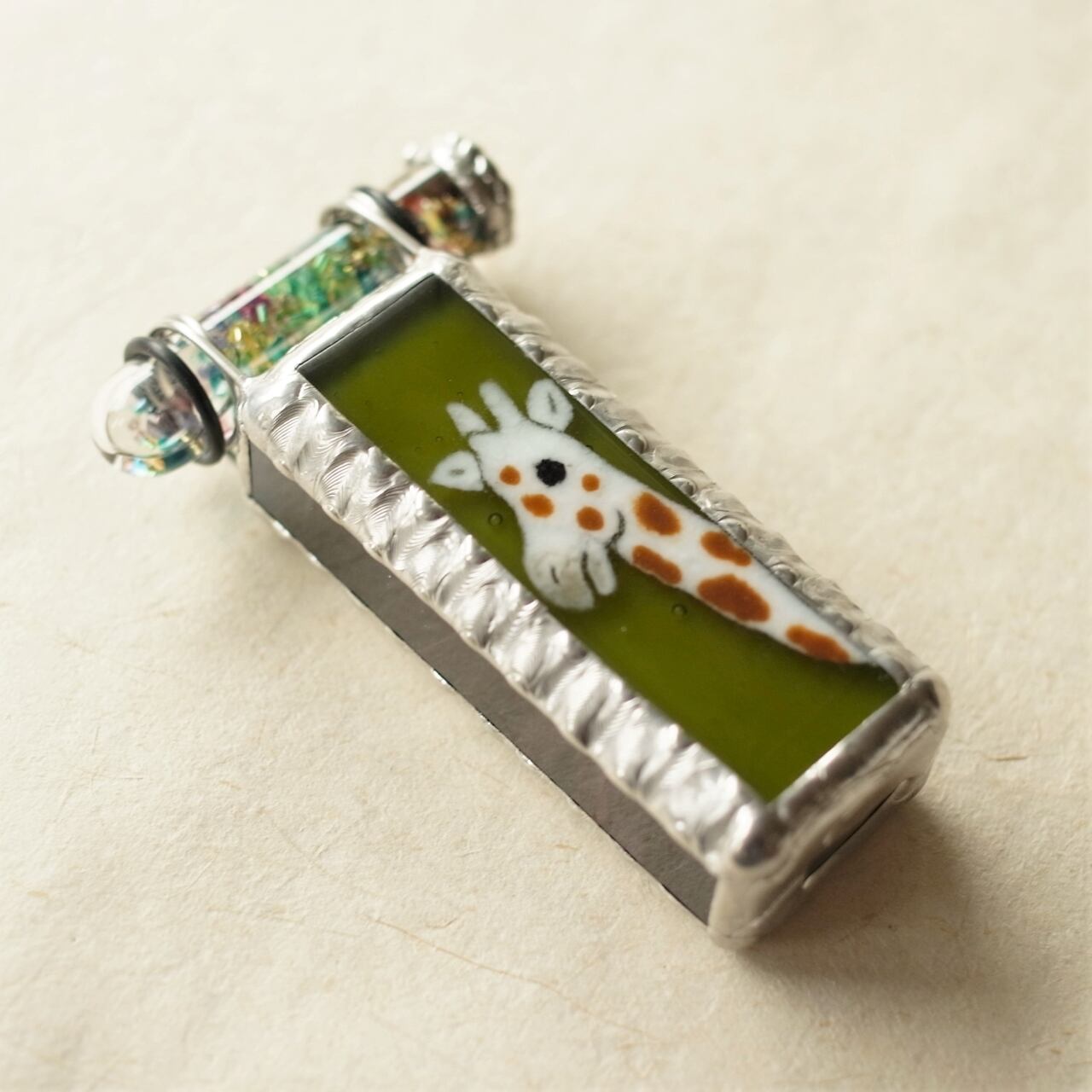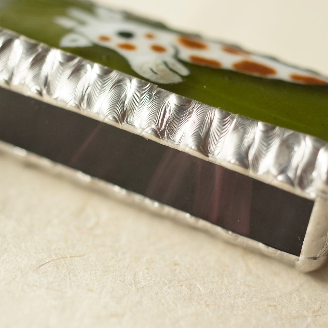 お抹茶のようなきみどり色の背景に、優しい表情をしたキリンが描かれています。脇と裏面のガラスは、マーブル模様が入った深いえんじ色。可愛すぎず渋すぎず、贈り物に選ばれることも多い人気の絵柄です。