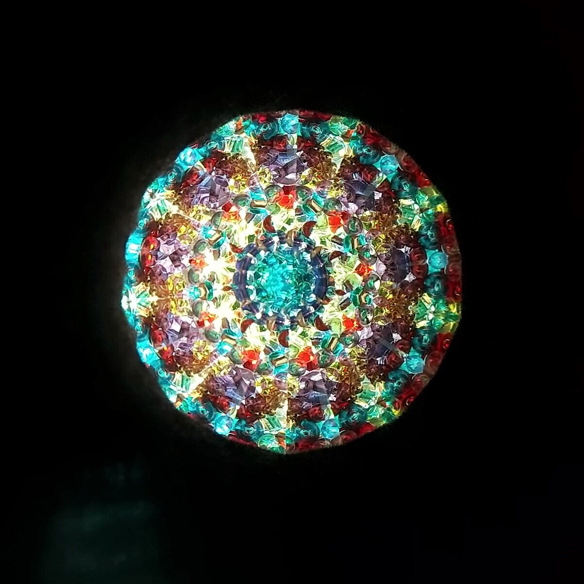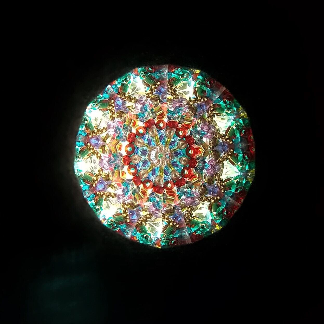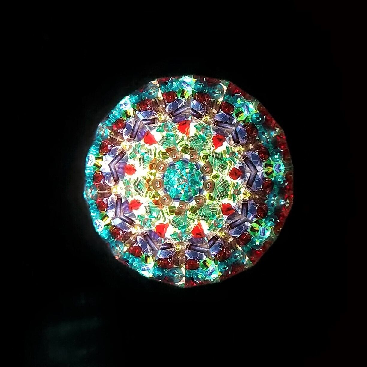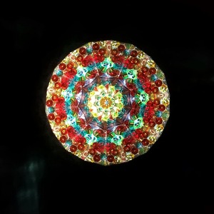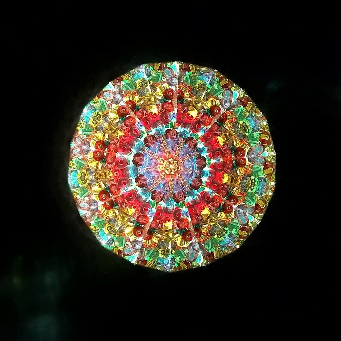 中を覗くと、濃い赤や紫、黄緑、エメラルドグリーンにゴールドと色数豊富で、教会のバラ窓のような深い色合いの映像をお楽しみ頂けます。