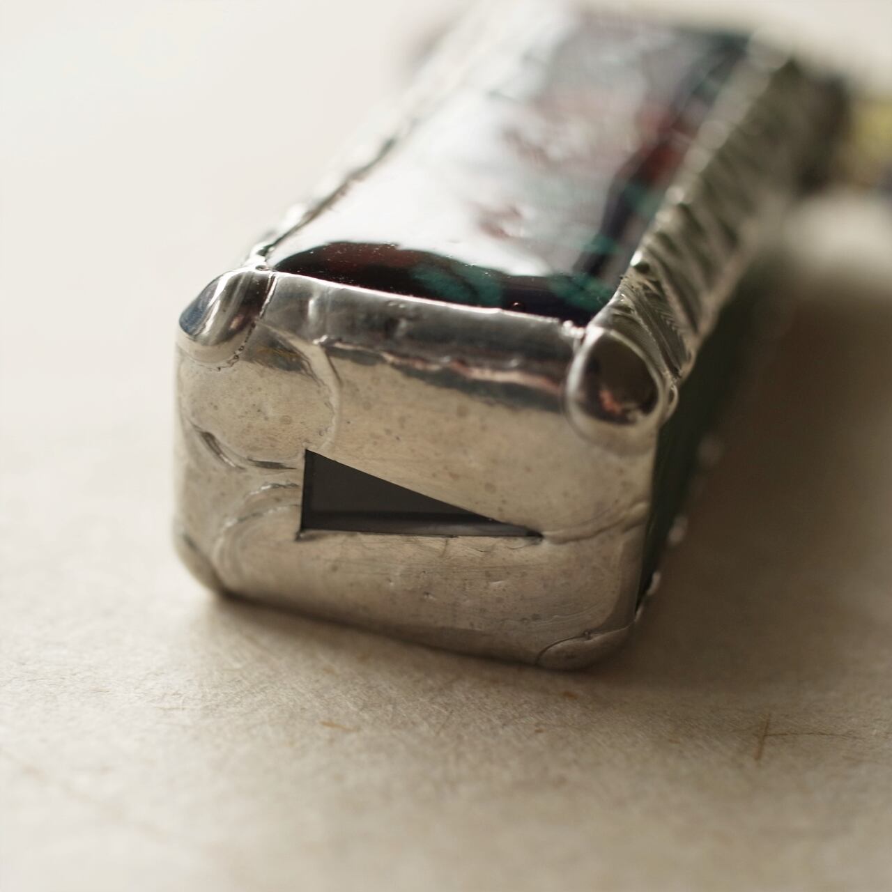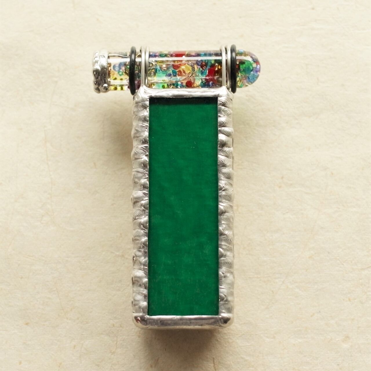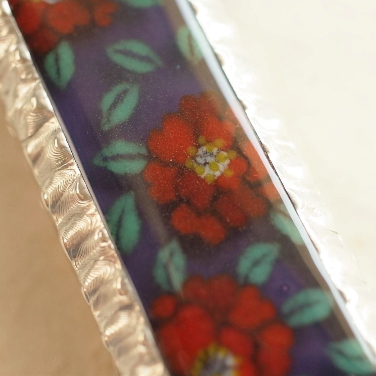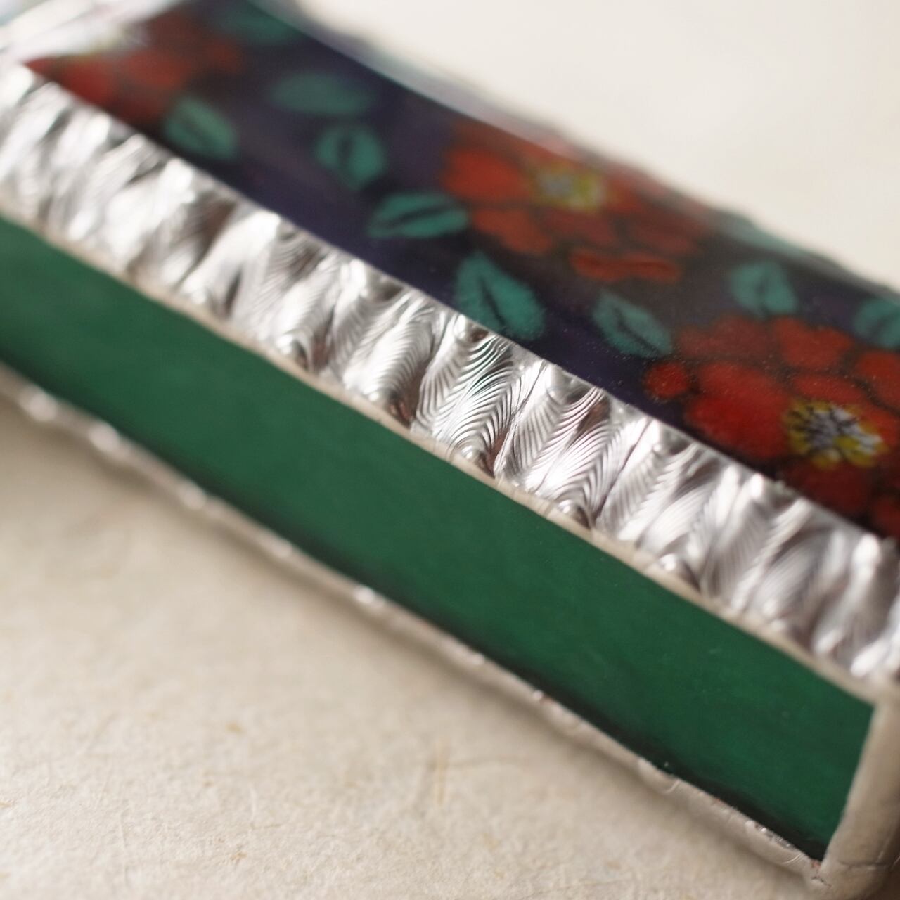 背景は濃い紫色。脇と裏面のガラスは葉の色に合わせて鮮やかなエメラルドグリーンで、さざ波のようにぽこぽことしたテクスチャーが入っています。