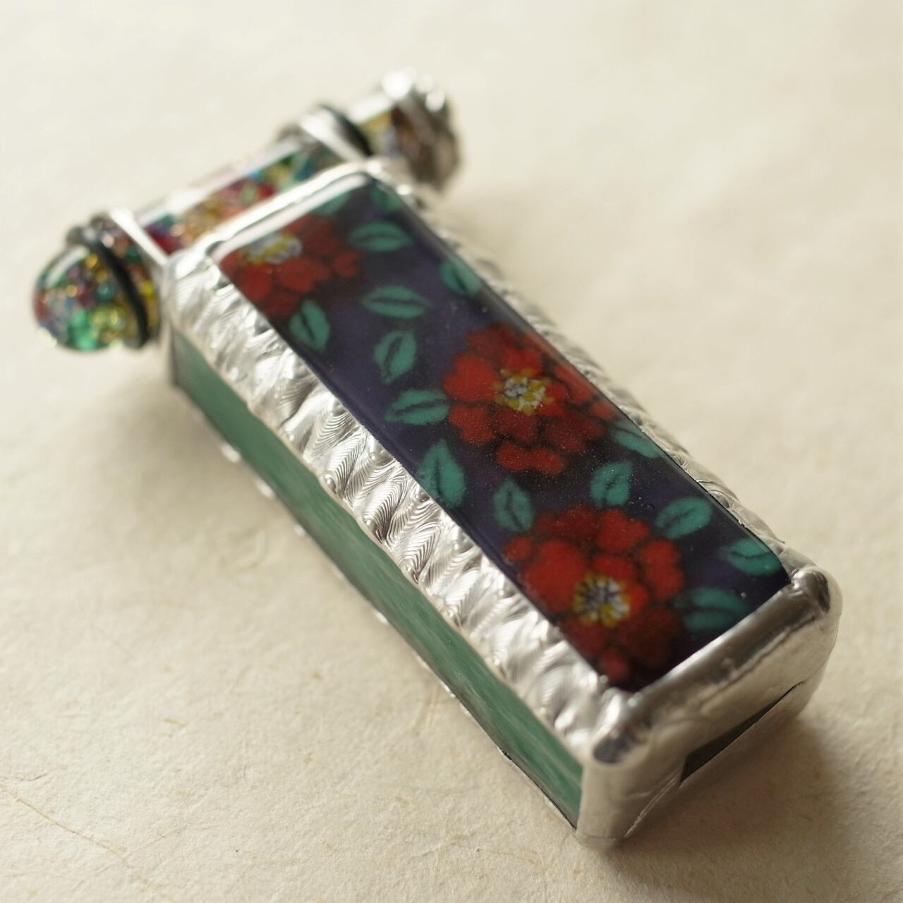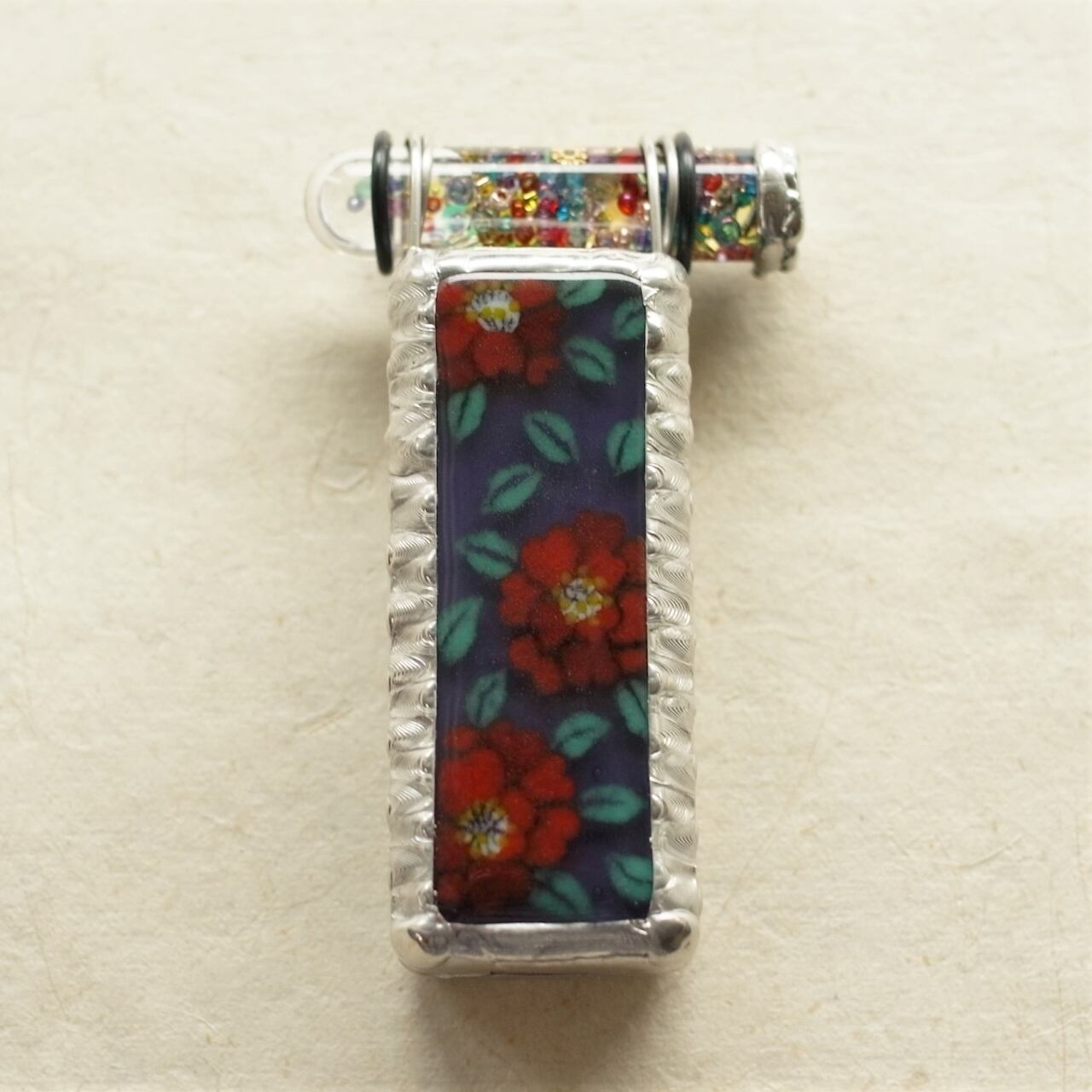 板ガラスの上にガラスの粉をのせて焼き付ける”ガラス胎七宝”の技法で絵付けした、みずあめやのてのひらサイズ万華鏡。