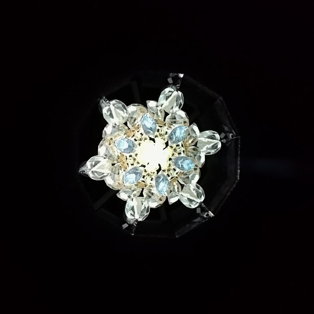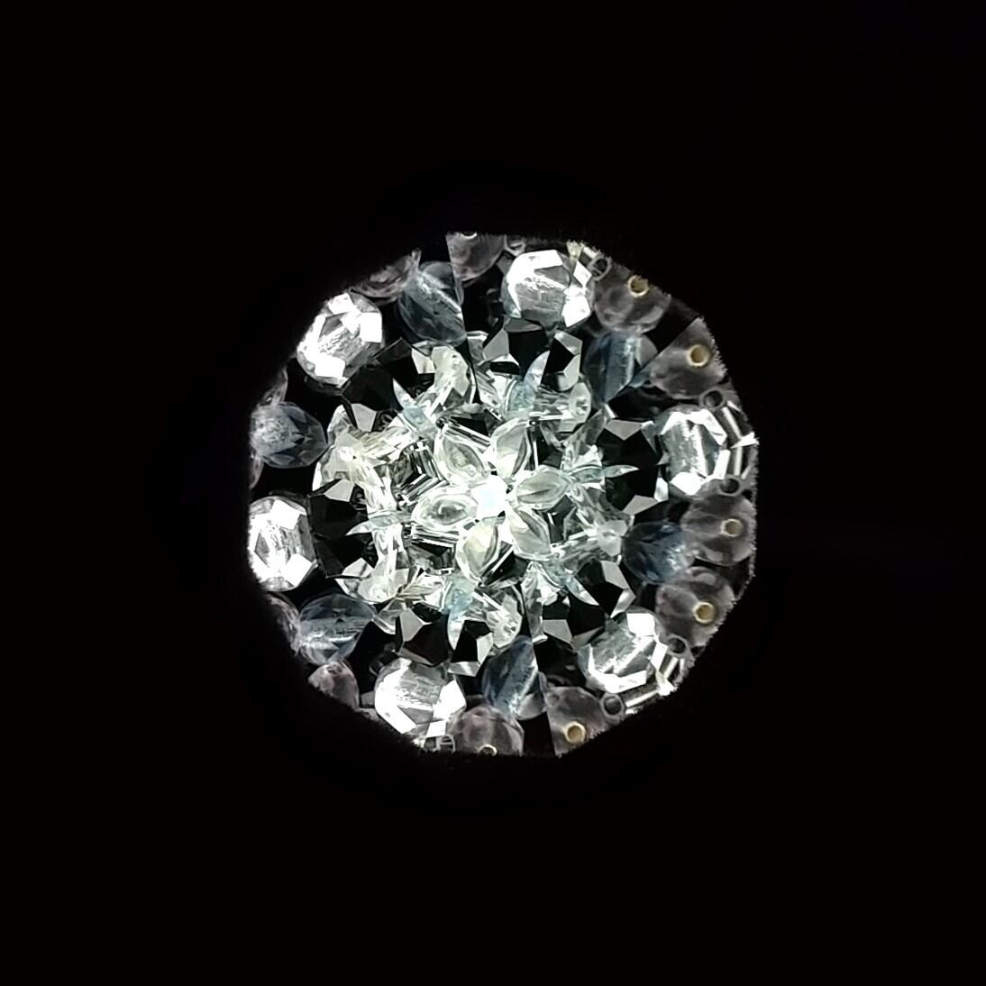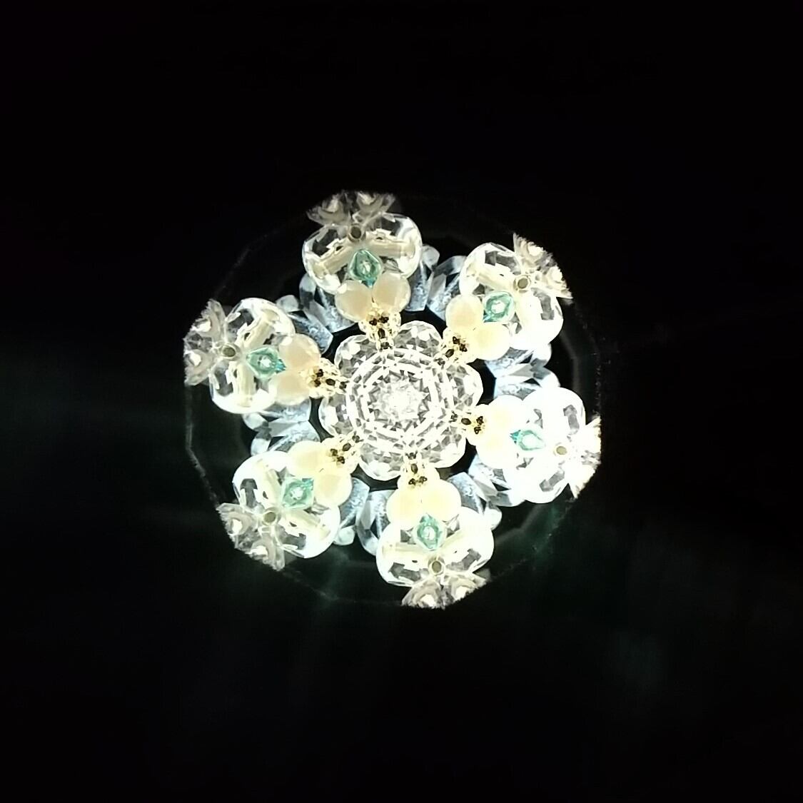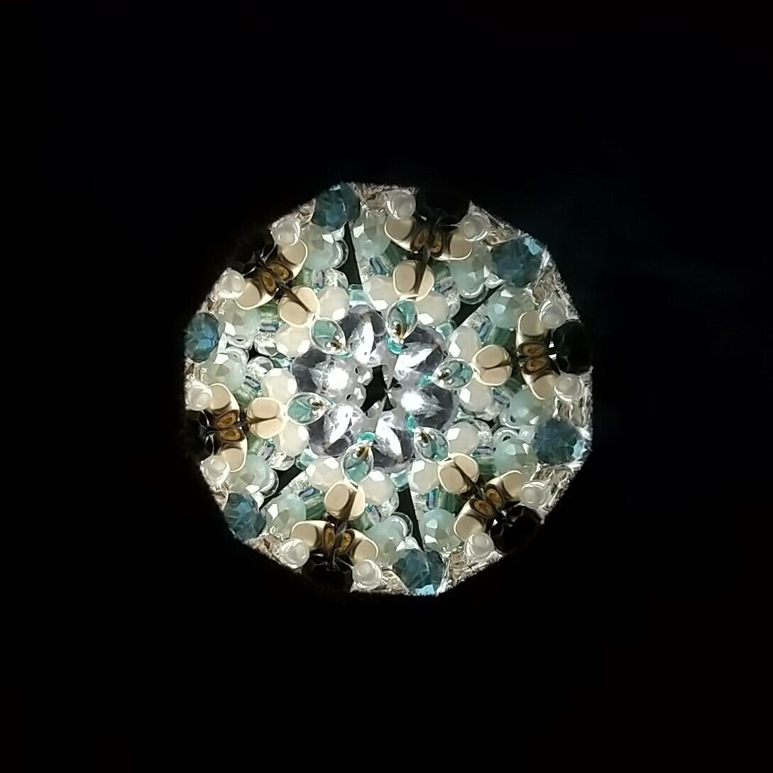 中には白、黒、ベージュ、グレー、ゴールドのビーズが詰められていて、ほぼモノトーンの世界ですが、時々翡翠のようなグリーンが現れて彩りを添えてくれます。雪の結晶のようだったり、アールデコのブローチのようだったり。ドライチェンバーならではの、回転させるとカシャカシャと鳴る音もお楽しみください。