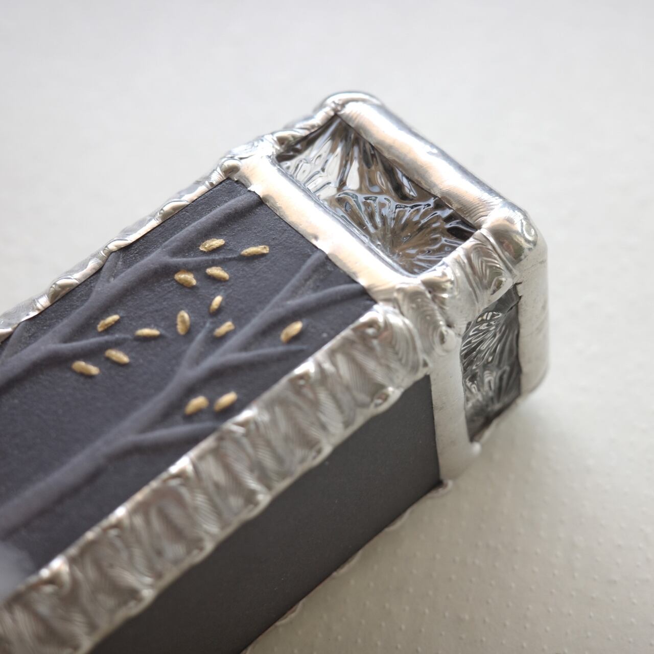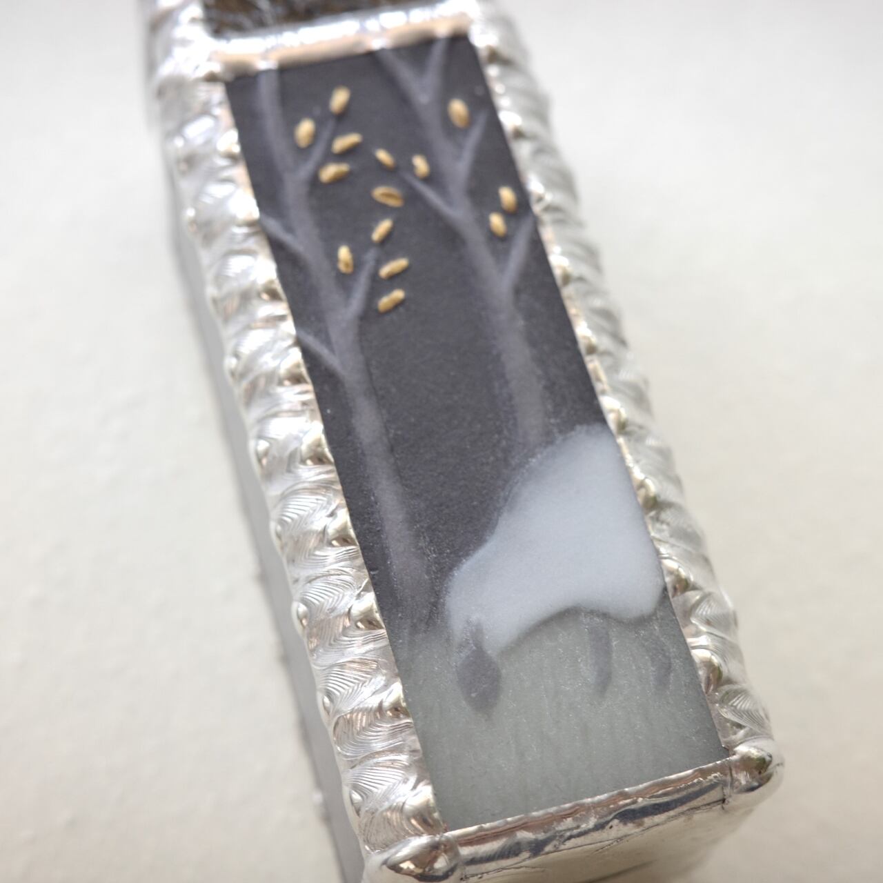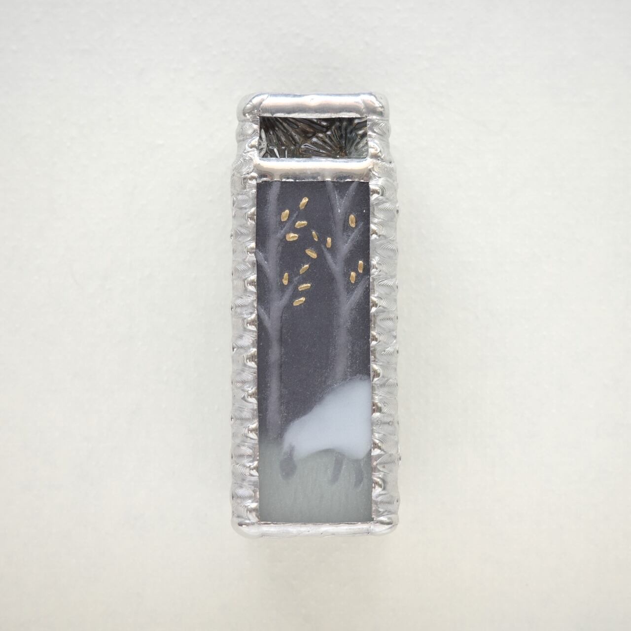 夜の森で白い羊が草を食んでいるこちらの作品は、最近モノトーンがマイブームのみずあめ姉の作品。タイトルに「ブラック」とありますが、真っ黒というより濃いグレーなので、ふわっと柔らかい印象です。地面の色はとても淡いミントグリーン。金色の葉がアクセントになっています。側面と裏面のガラスは紫みを帯びたグレーです。