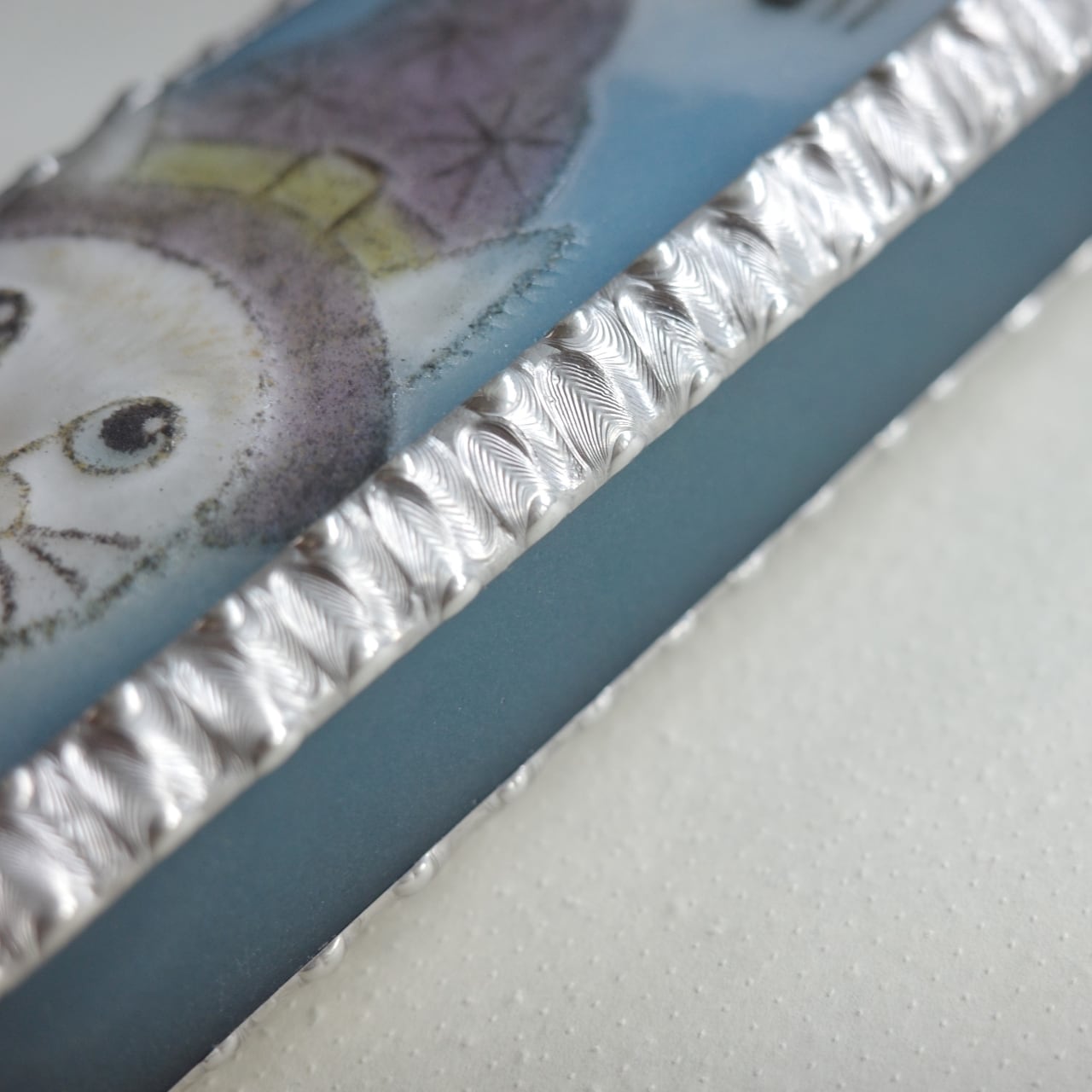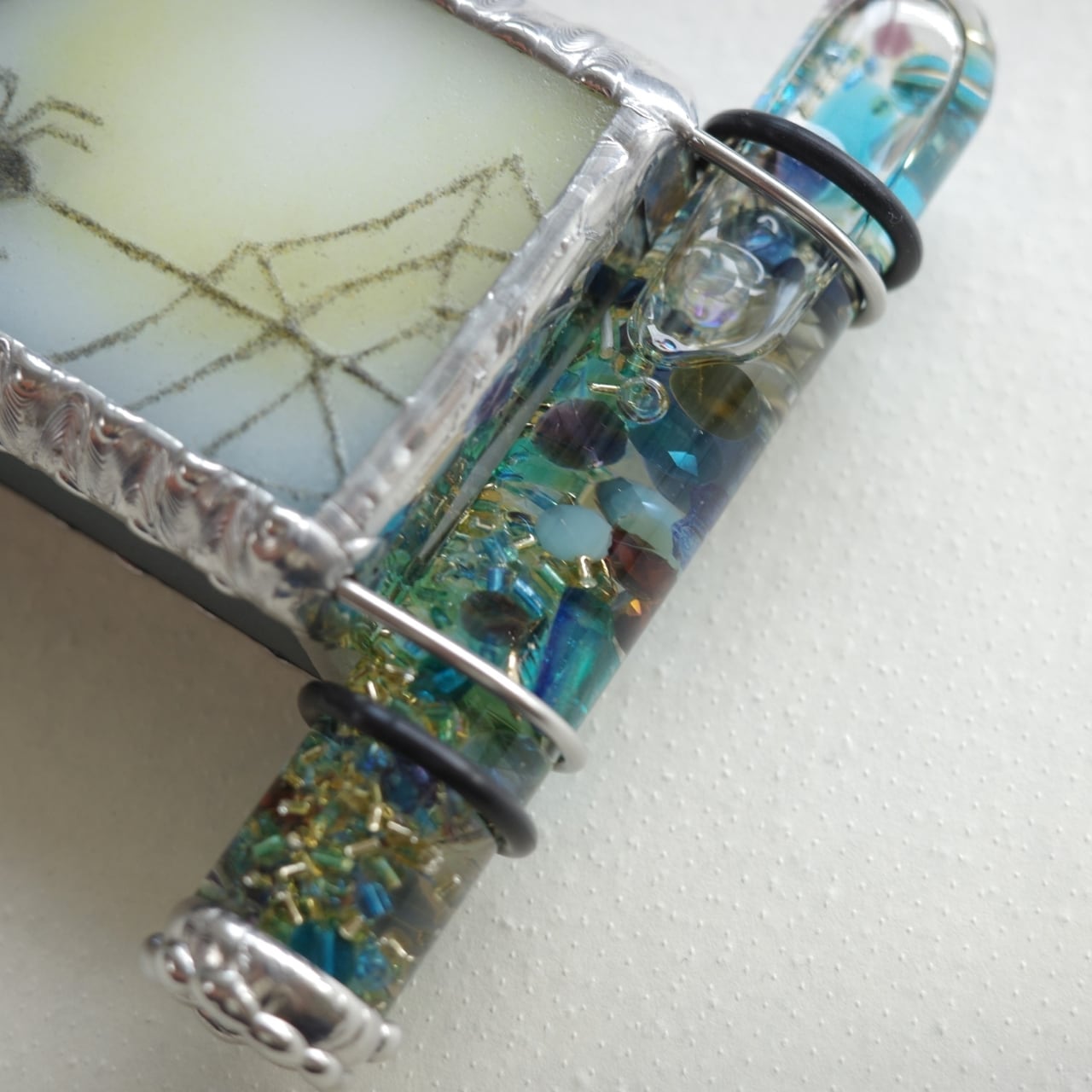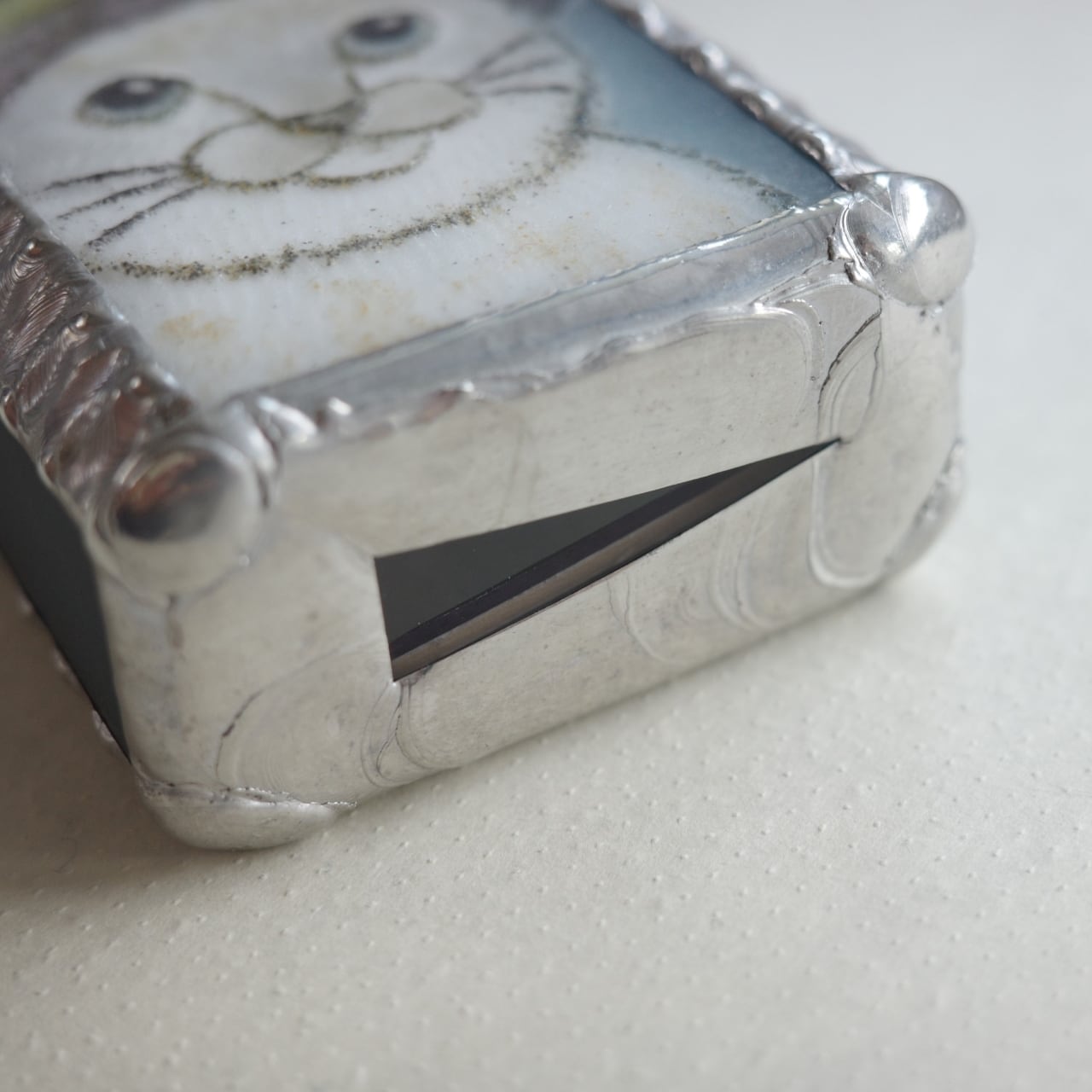 側面と裏面のガラスは渋い青緑色。すべてパートドヴェール技法で焼いたもので、マットな質感が特徴です。