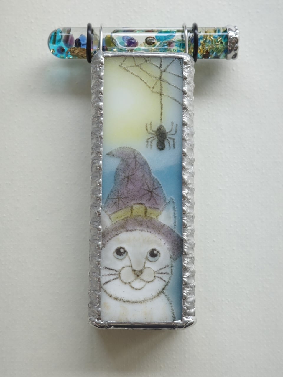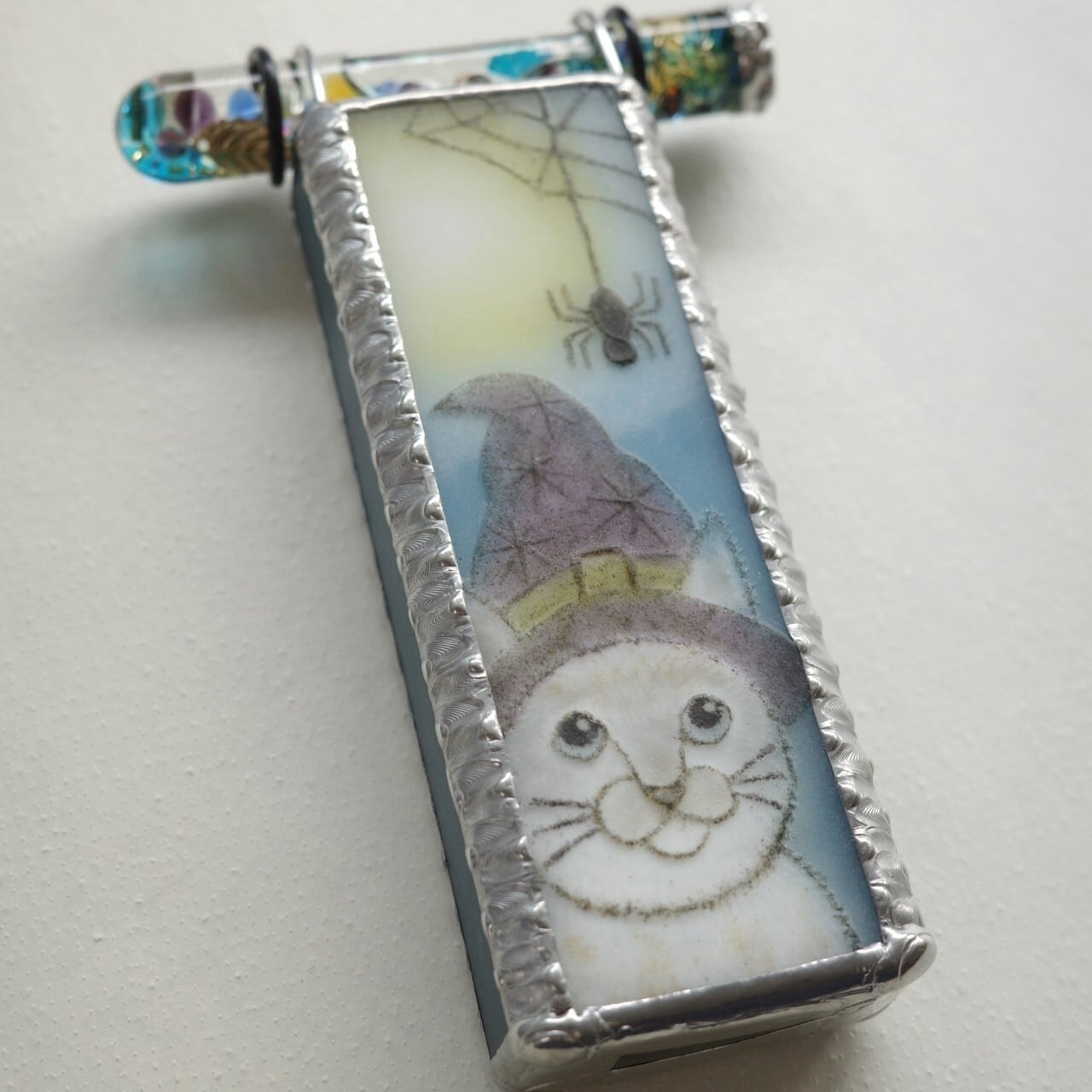魔法使いのような帽子をかぶった白猫が、巣からつーっと下りてきた蜘蛛をじっと見つめています。まるで絵本の挿絵のような、物語を感じさせるみずあめ妹の作品です。