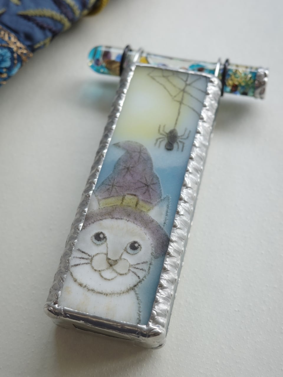作品のイメージに合わせて1点ずつ手づくりしている専用の袋もセットで届け。青みがかったグレーの地に辛子色の刺繍があしらわれた生地と、きらびやかな青い刺繍リボンをはぎ合わせてあります。