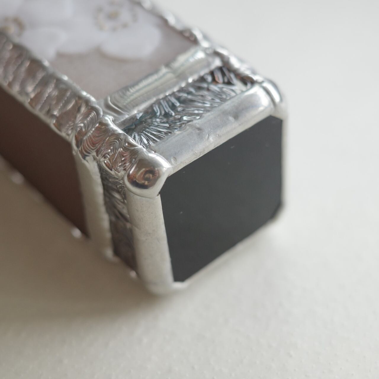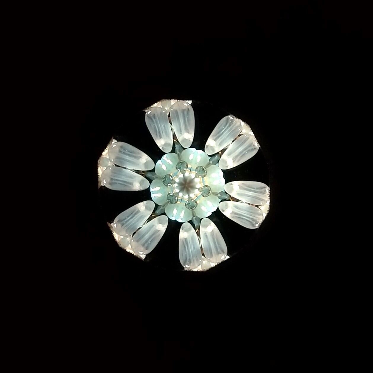 中の映像は、オパールホワイトとゴールドが中心、そこにグレーやベージュピンク、淡いグリーンなどがかすかな彩りを添えています。黒い背景に淡い色たちがよく映えて、アンティークのブローチのような映像。ドライチェンバーならではの、回転させるとカシャカシャと鳴る音もお楽しみください。