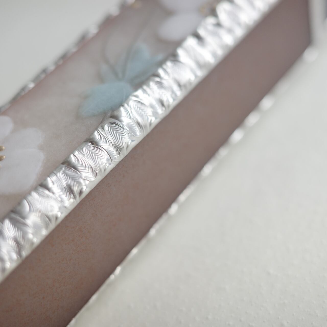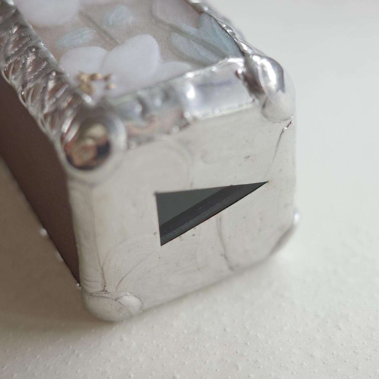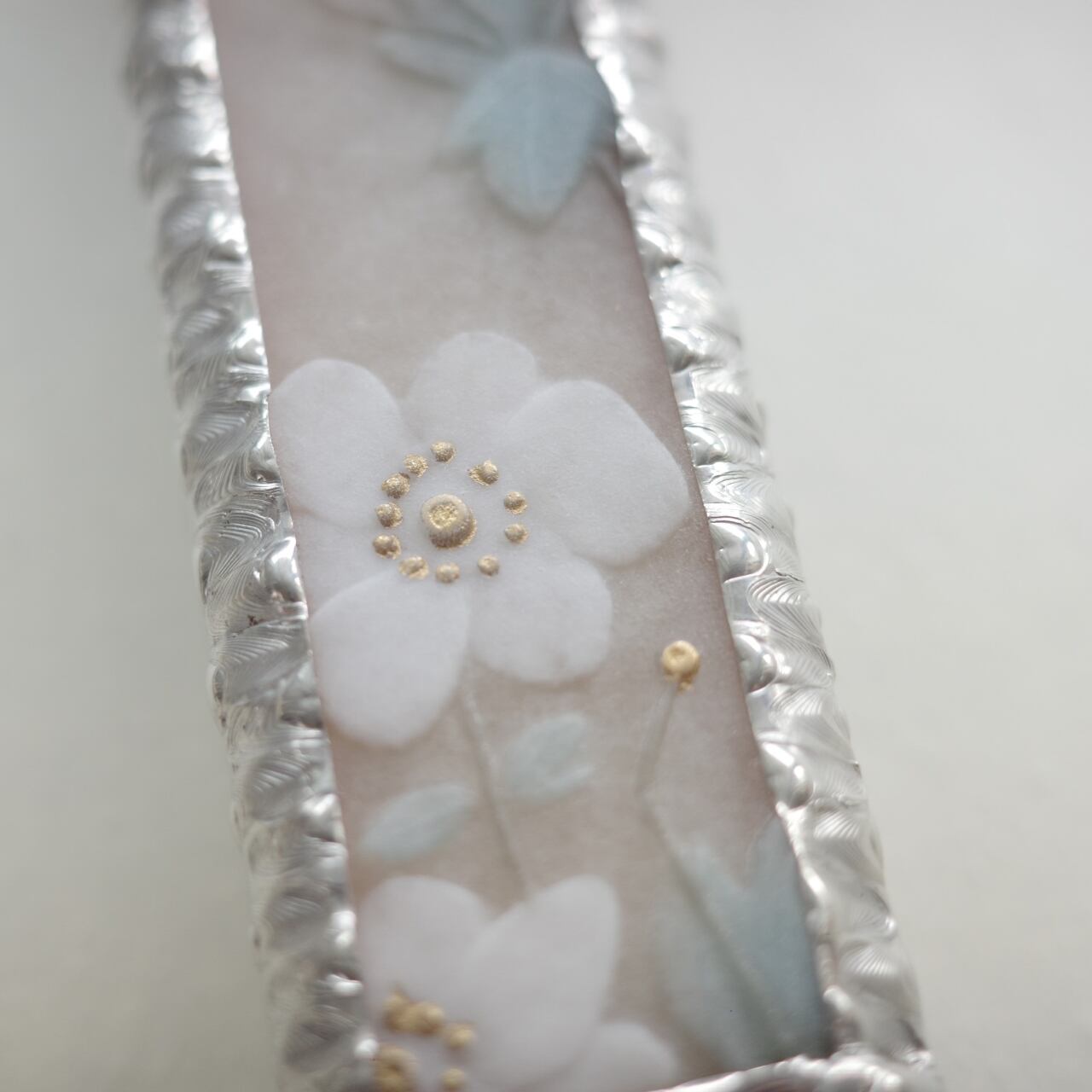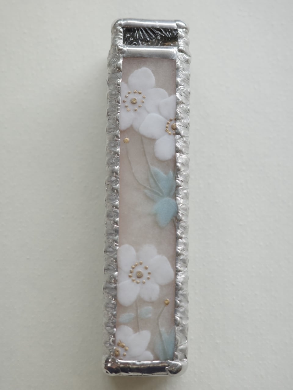ミルクティーのようなベージュの背景に、真っ白なシュウメイギクの花と、淡いターコイズ色の葉が描かれています。脇と裏のガラスは落ち着いたレンガ色。ふんわりとした淡い色調の中、花の中心に塗られた金彩がアクセントになっています。