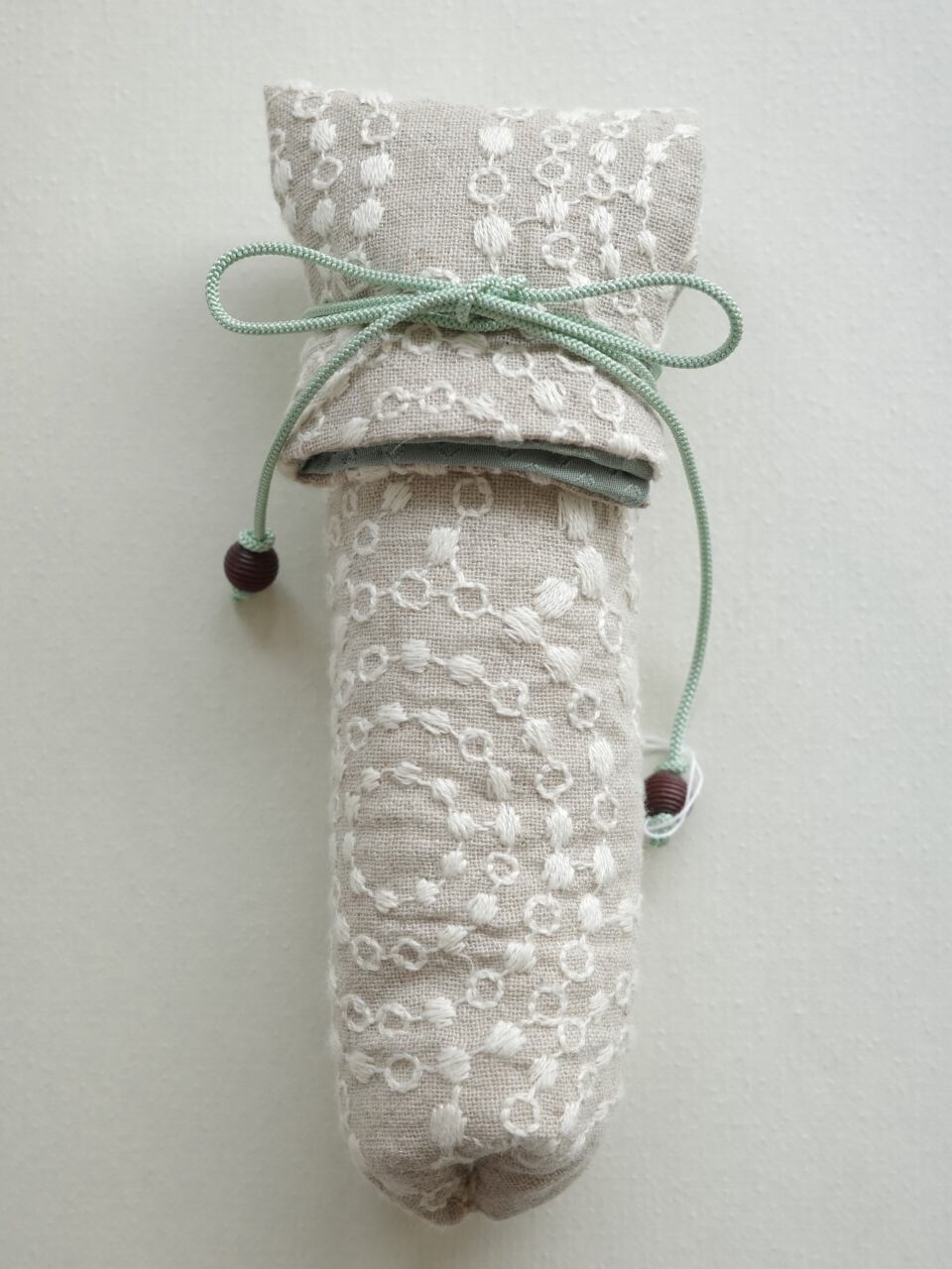 作品のイメージに合わせて1点ずつ手づくりしている専用の袋もセットでお届け。