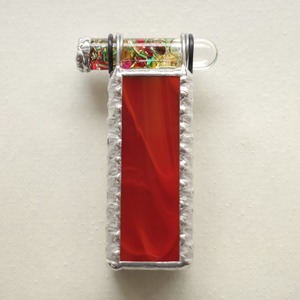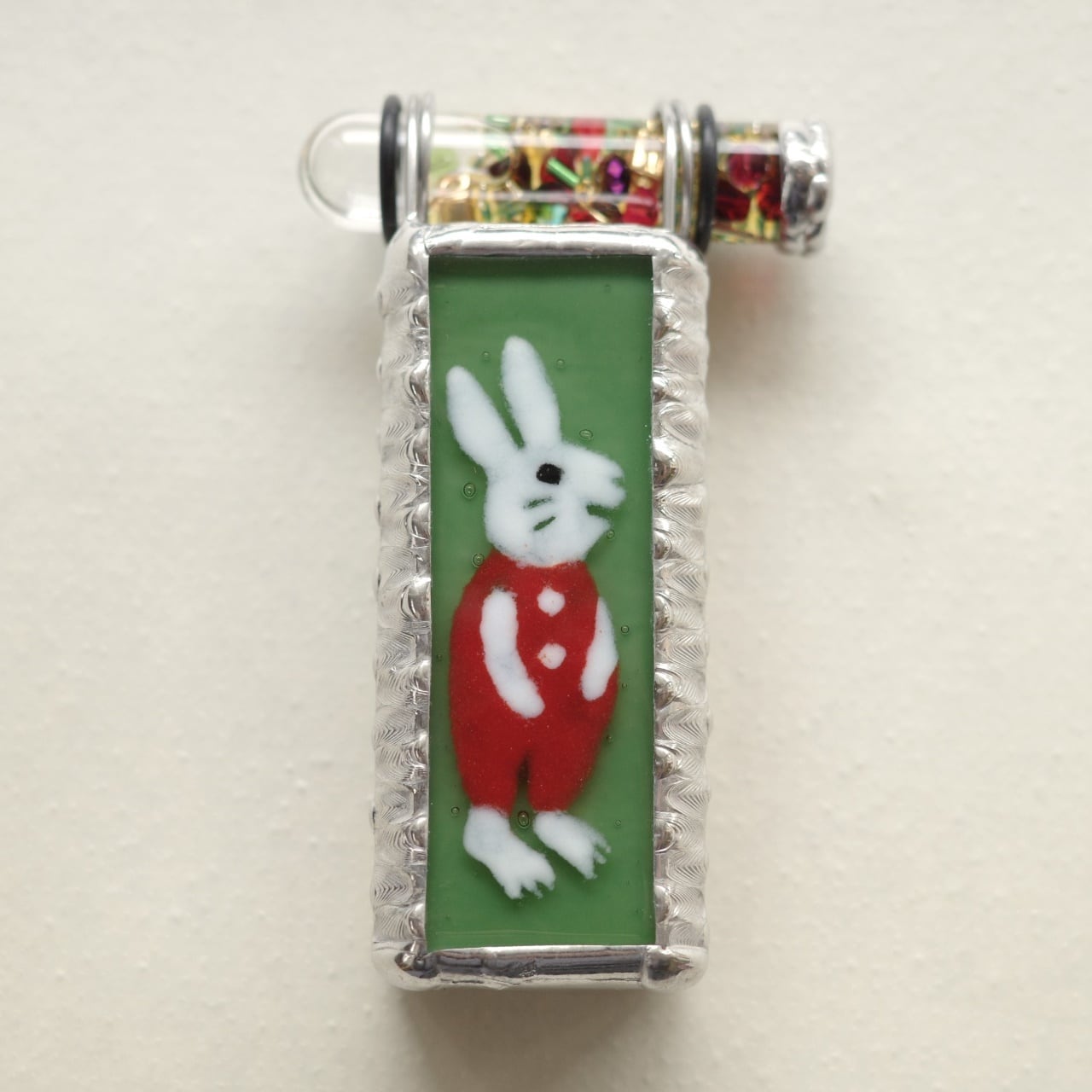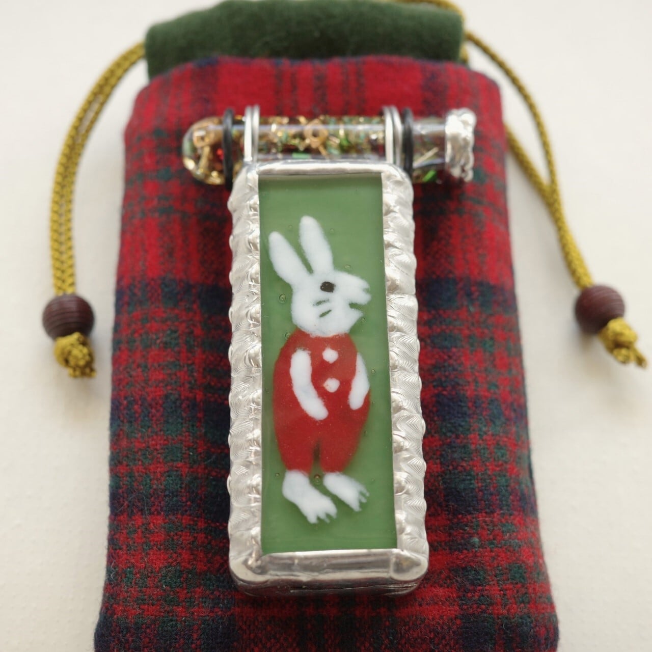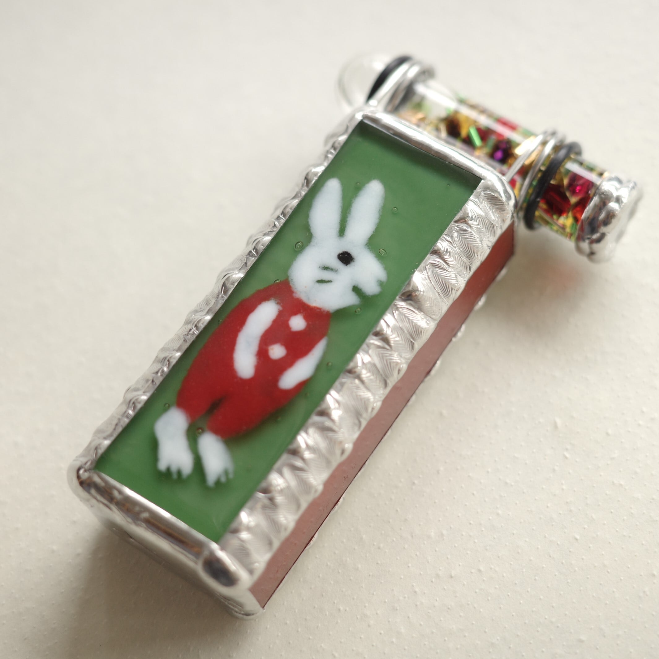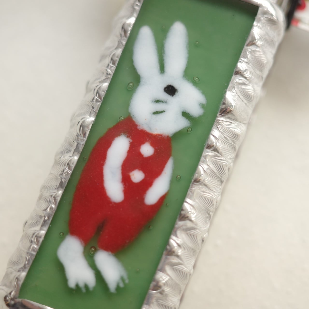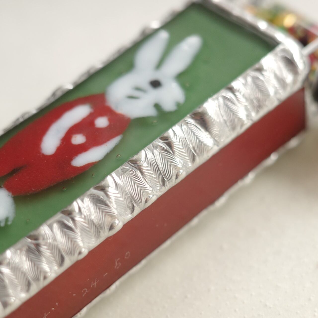 グリーンのガラスに赤いロンパースを着たウサギは季節を問わず作っている定番柄ですが、いかにもクリスマスっぽいですよね?というわけで今回冬柄たちの仲間に入れてあげました。側面と裏面のガラスは、マーブル模様入りの赤いガラス。とても鮮やかな色合いです。