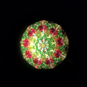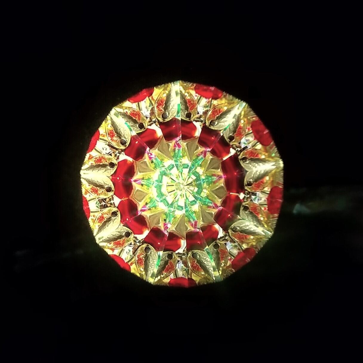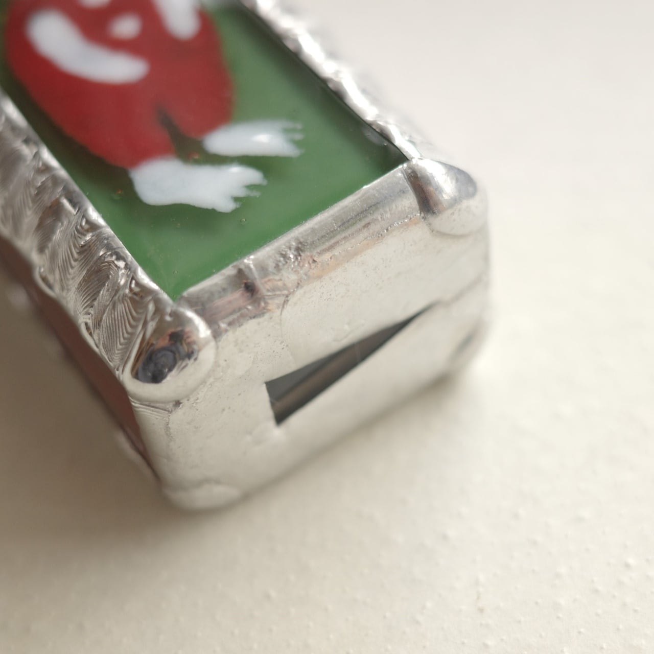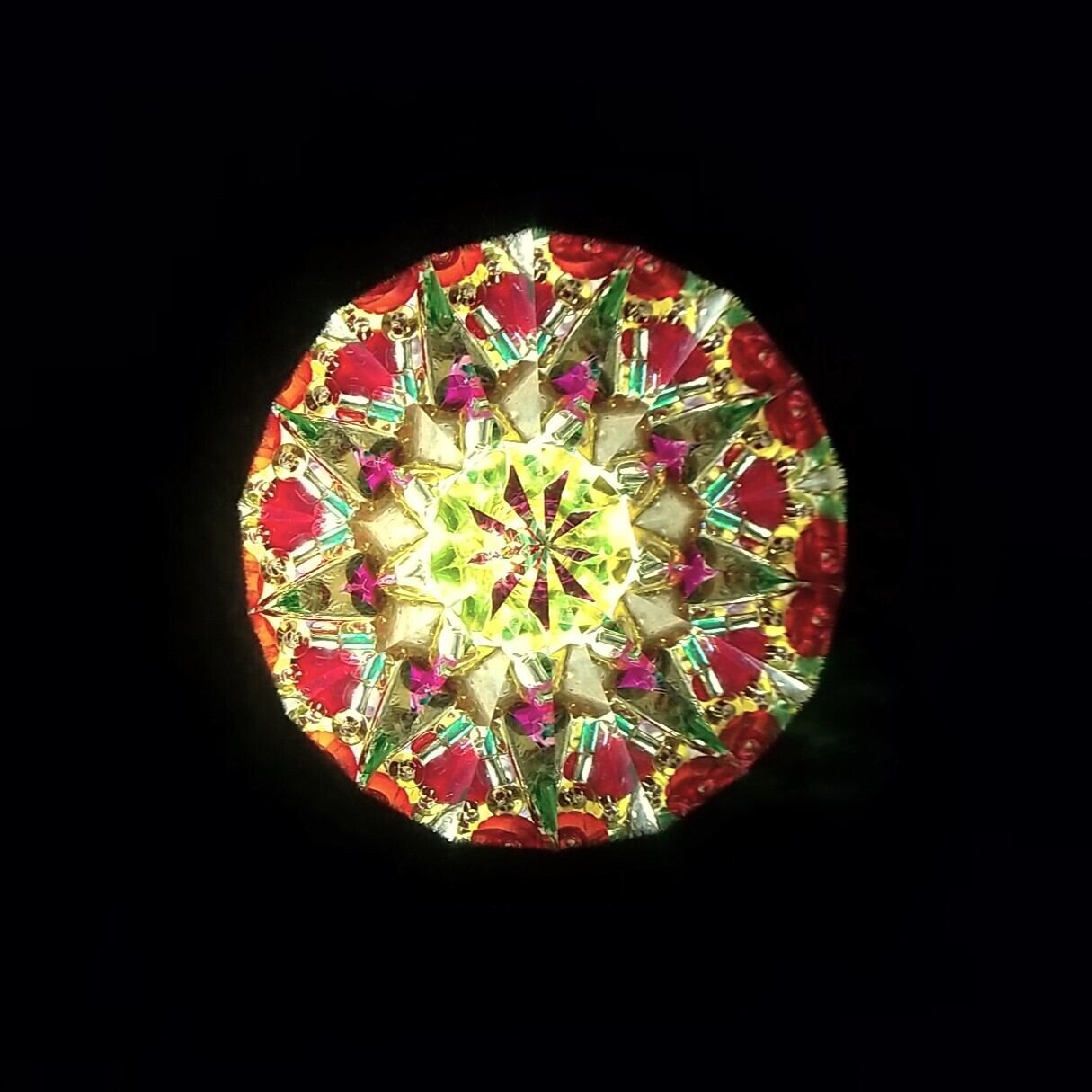 板ガラスの上にガラスの粉をのせて焼き付ける“ガラス胎七宝”の技法で絵付けした、みずあめやのてのひらサイズ万華鏡。