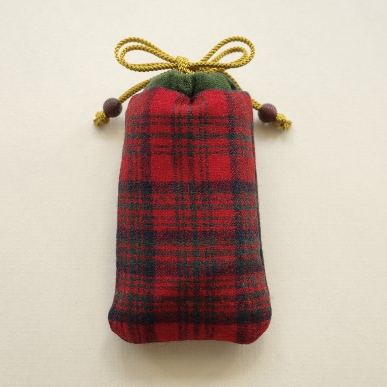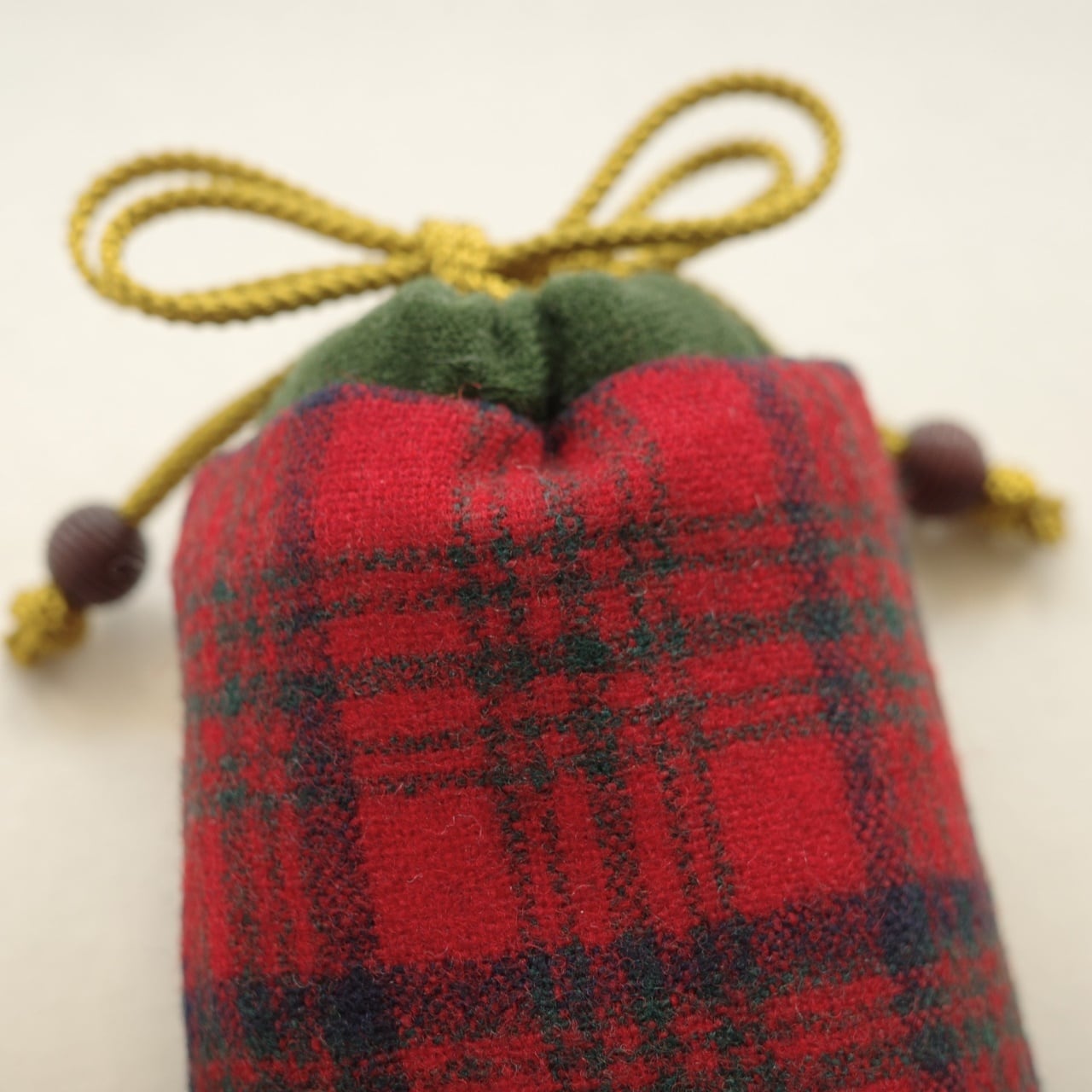 作品のイメージに合わせて1点1点手作りしている専用の袋もセットでお届け。赤いタータンチェック柄の冬らしい布で仕立てました。ウールがしっかりブレンドされた温かみのある厚手の生地です。口布はモミの木のようなダークグリーン色の起毛生地を使用しています。