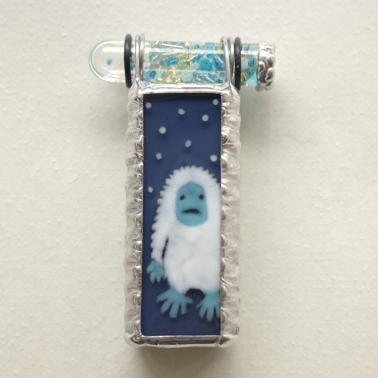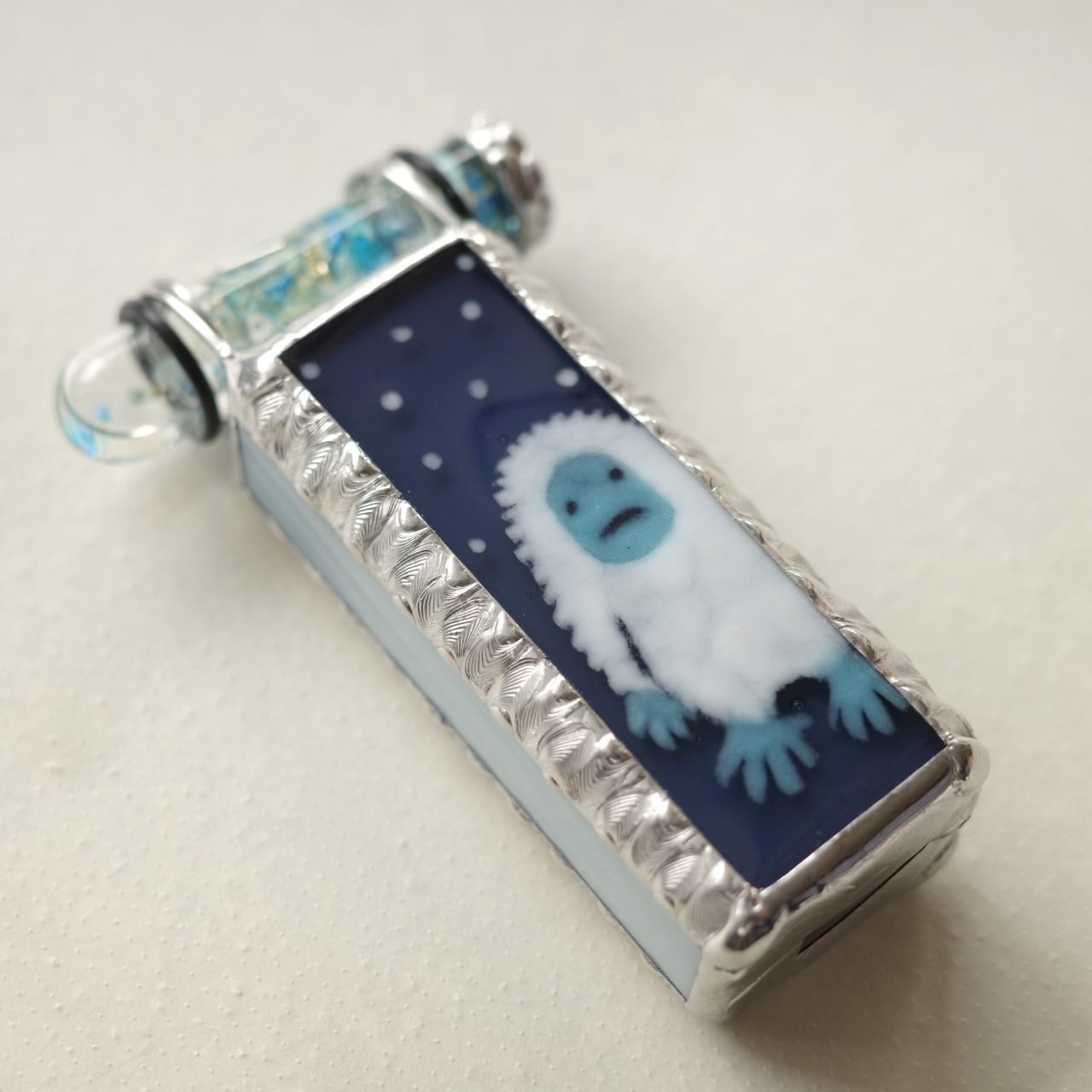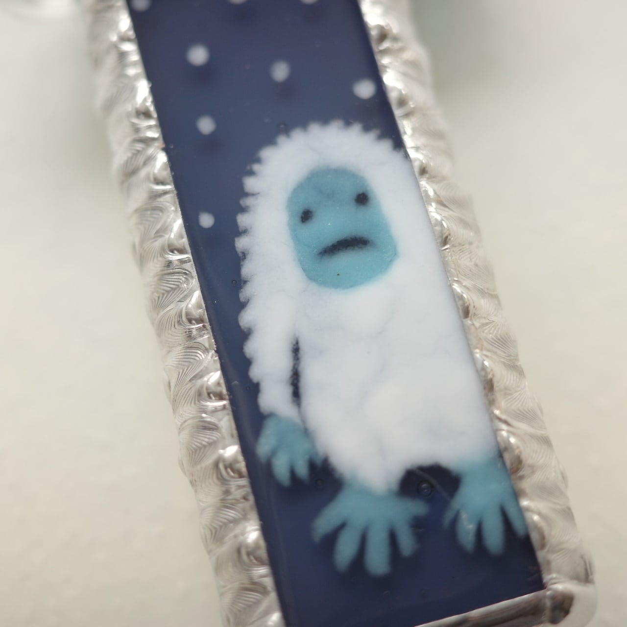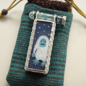 雪が舞うブルーグレーの闇にぬぅっと佇んでいるのは謎の生き物、イエティです。実はイエティ、みずあめやの絵柄としてはもう10年以上前からある古株なのです。今回冬の仲間たちと一緒に久しぶりに復活させました。