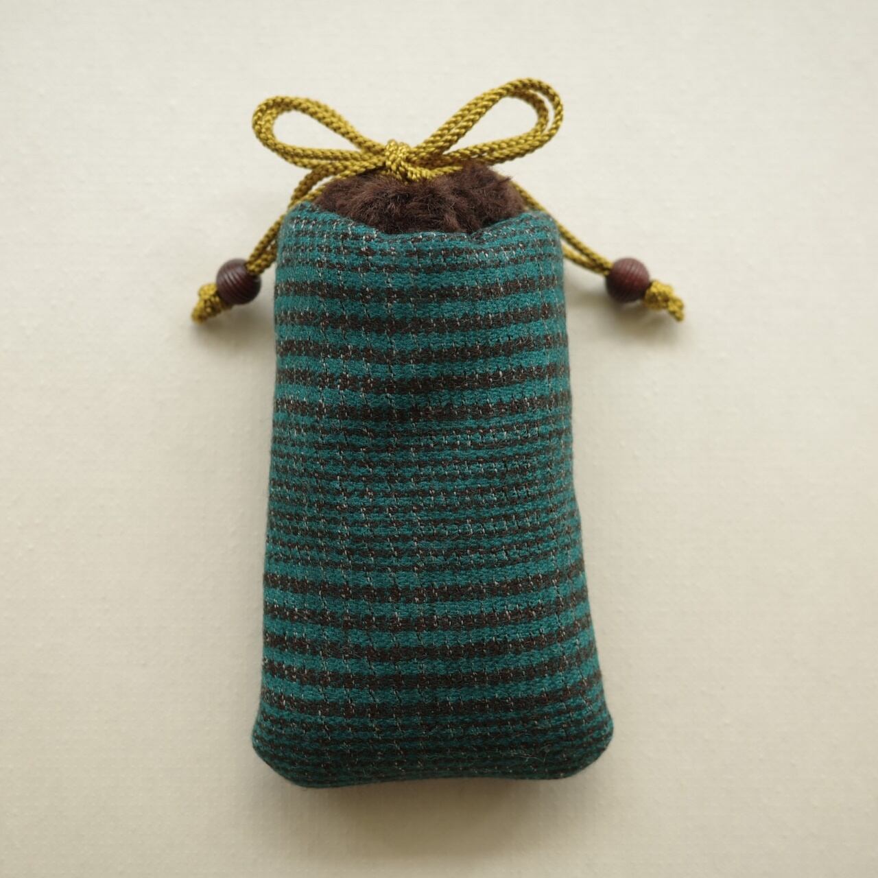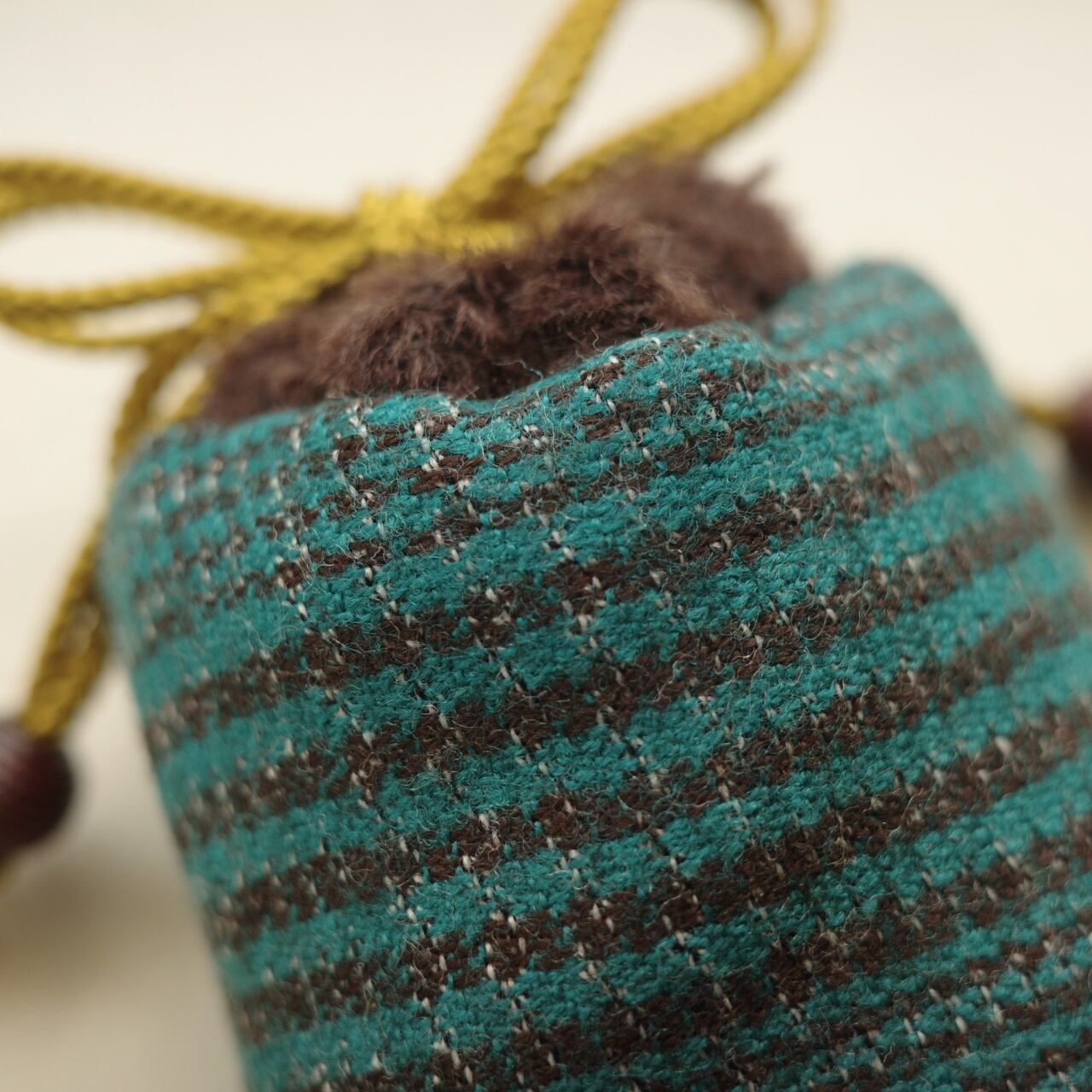 作品のイメージに合わせて1点1点手作りしている専用の袋もセットでお届け。エメラルドグリーンとこげ茶の冬らしい布は、グレンチェックと呼ばれる柄の一種。原材料は定かではありませんが、少しチクチクとしたウールが含まれているようで、温かみのある厚手の生地です。口布には茶色いモコモコのフェイクファーを使用しました。